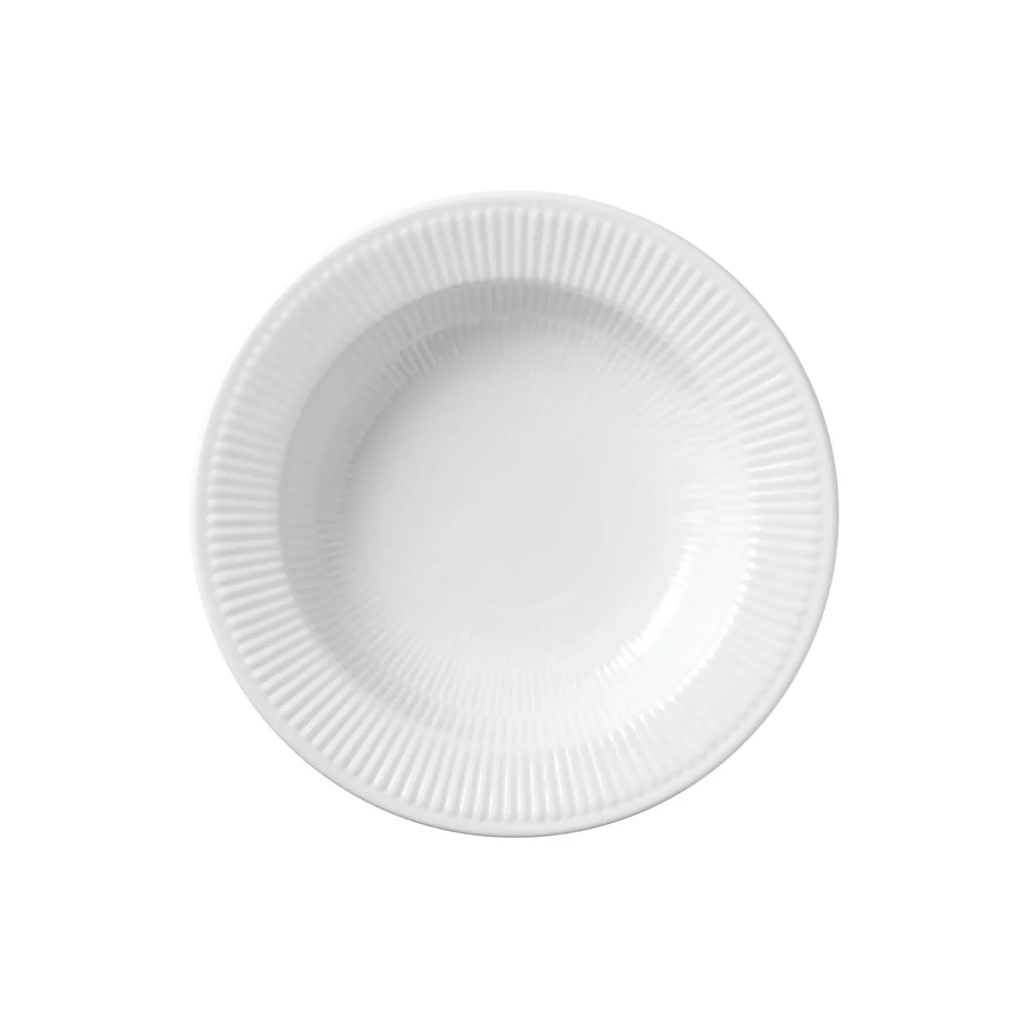 Hvid Riflet dyb tallerken i porcelæn fra Royal Copenhagen. På denne Hvid Riflet Dyb Tallerken på 30 cm fremhæves de håndudskårne rifler i særlig stil på den brede kant. Den dybe tallerken er ideel til smukke portionsanretninger, som en pastatallerken eller som salatskål.