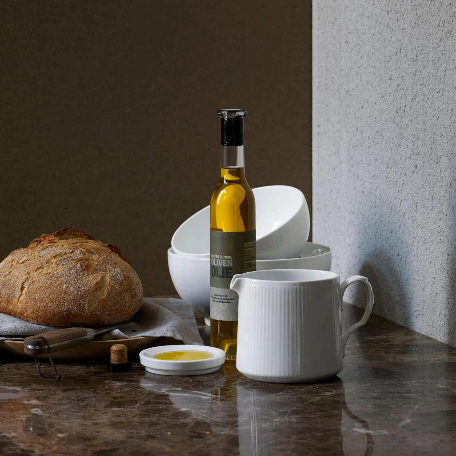 Hvid Riflet kande i porcelæn fra Royal Copenhagen. Med et udtryk, der præges af både funktionalitet og skønhed, er denne Hvid Riflet Kande på 70 cl det perfekte kanvas til farverige, læskende drikke. Placér kanden på en lille tallerken og brug den også som saucekande.