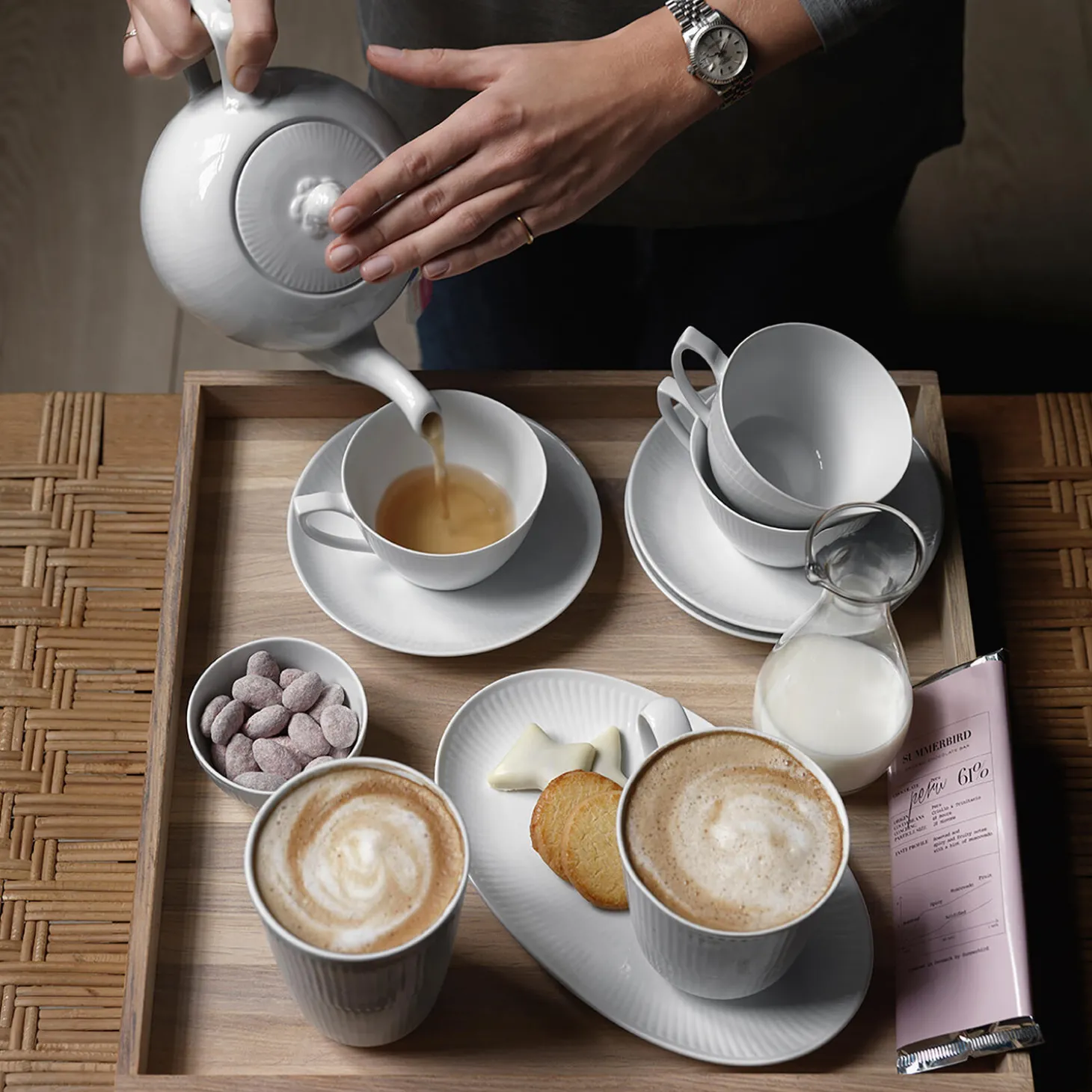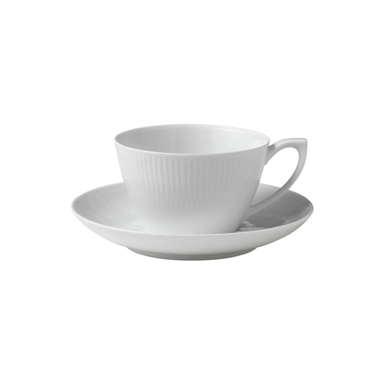 Hvid Riflet kop med underkop i porcelæn fra Royal Copenhagen. Denne Hvid Riflet Kop og underkop på 28 cl har en konkav hank, som skaber et dragende modspil til porcelænskoppens runde form. Koppens store åbning gør den velegnet som tekop, hvor teen hurtigt køles ned til en behagelig temperatur og en perfekt udvikling af teens smag.