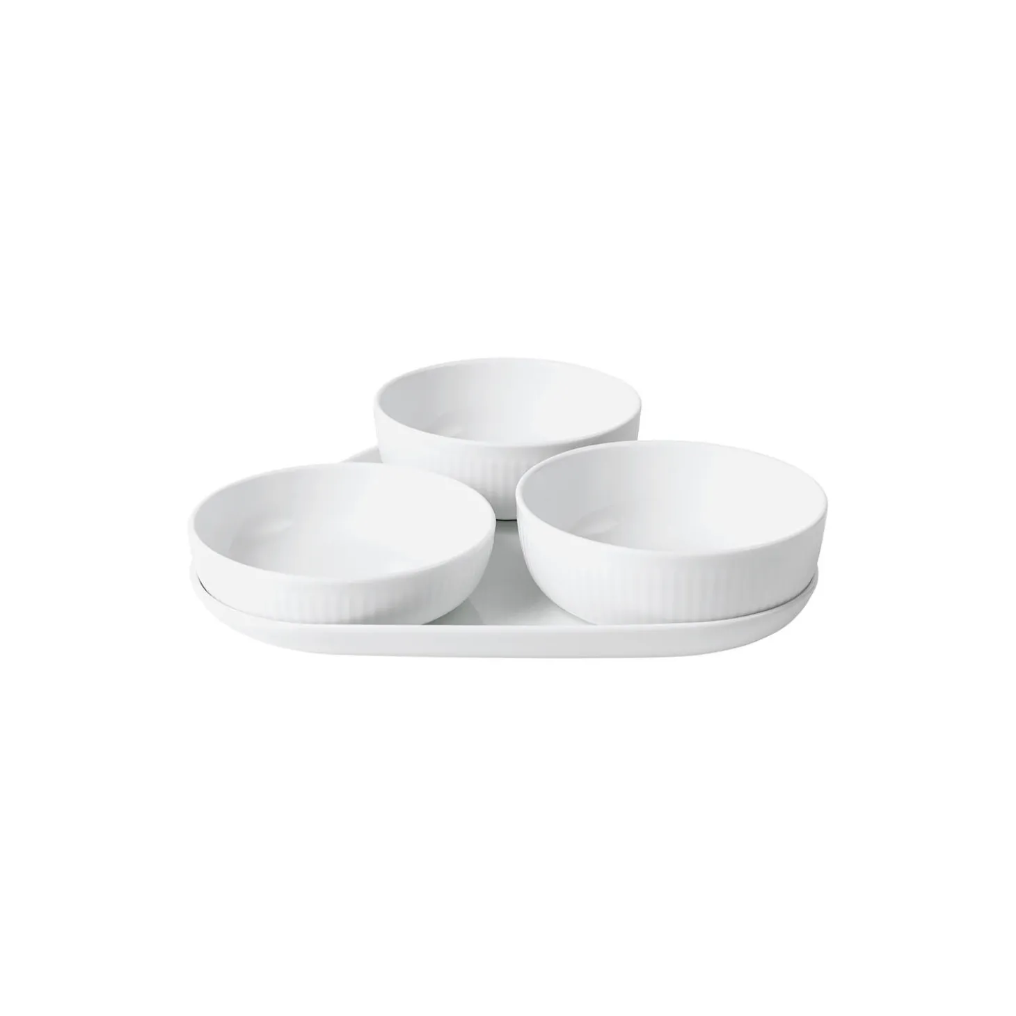 Minimalismen i det hvide riflede serveringssæt understøtter dets alsidighed. Sættet består af to små skåle og en lidt større skål på et trekantformet fad for nem opbevaring og servering. Hvert stykke kan bruges alene eller sammen. Perfekt til hverdag eller til underholdning derhjemme.