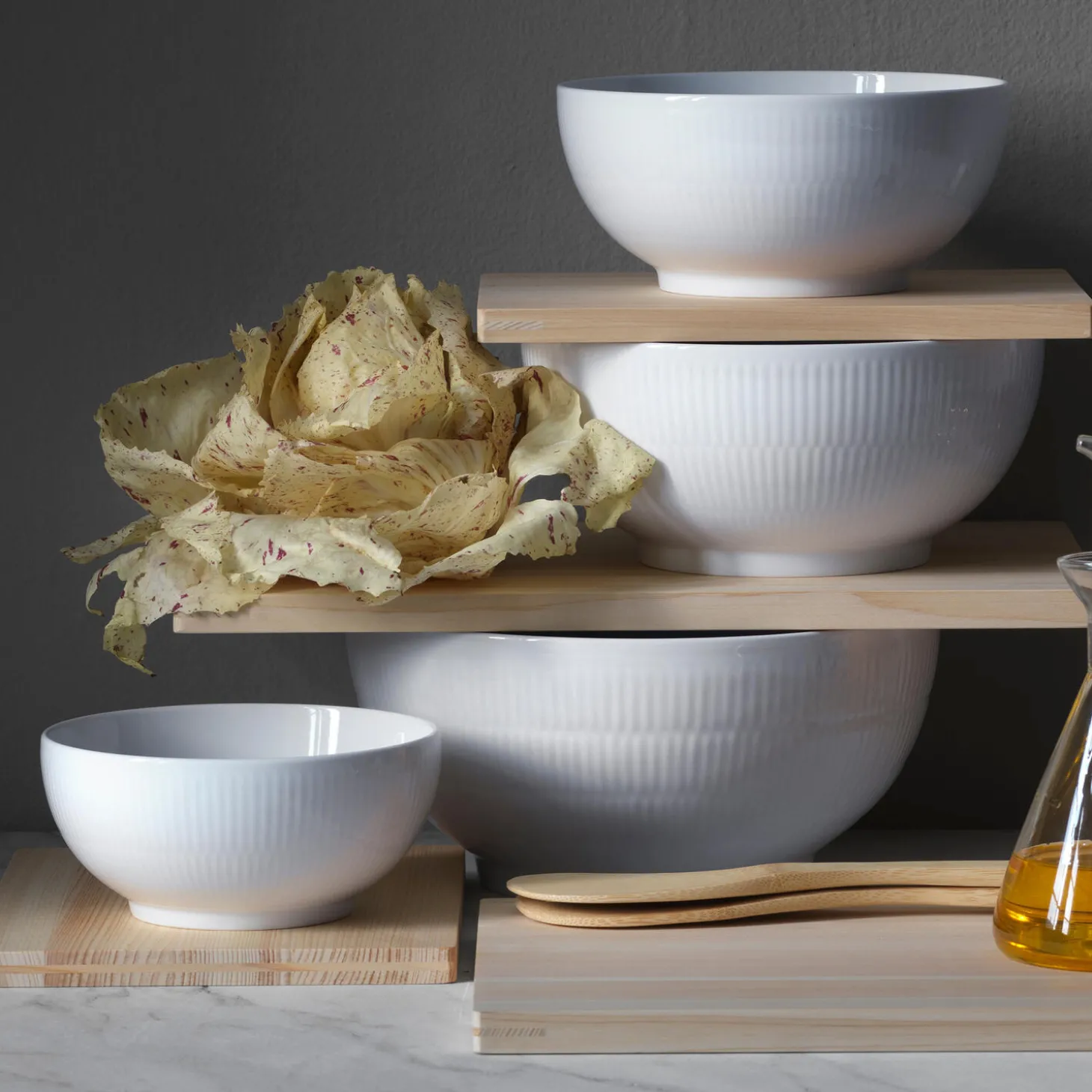 Hvid Riflet skål i porcelæn fra Royal Copenhagen. De ikoniske, håndlavede rifler træder frem på ydersiden af denne smukke Hvid Riflet Skål på 110 cl, mens skålens inderside er holdt glaseret og spejlblank. Brug det hvide kanvas til dit eget kunstværk af lækre serveringer eller smukke dekorationer.
