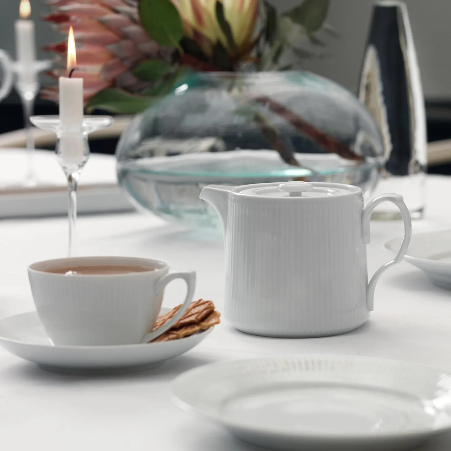 Den runde form på denne Hvid Riflet Tekande på 75 cl er indbegrebet af det enkle udtryk, der kendetegner Hvid Riflet-stellet. Porcelænskanden prydes af taktile rifler langs hele overfladen, mens det flade låg skaber et overraskende geometrisk element til steldelen. Hvid Riflet er skabt fra grundformen på Musselmalet Riflet og er et stel, der er minimalistisk, ubemalet og evigt klassisk. Stellets enkle, hvide overflade får hver steldel til at skille sig ud i håndmalet elegance, hvor de ikoniske rifler i porcelænet får lov at stråle. Hver steldel i Hvid Riflet er smuk i sig selv eller i kombination med et eller flere af Royal Copenhagens håndmalede stel.