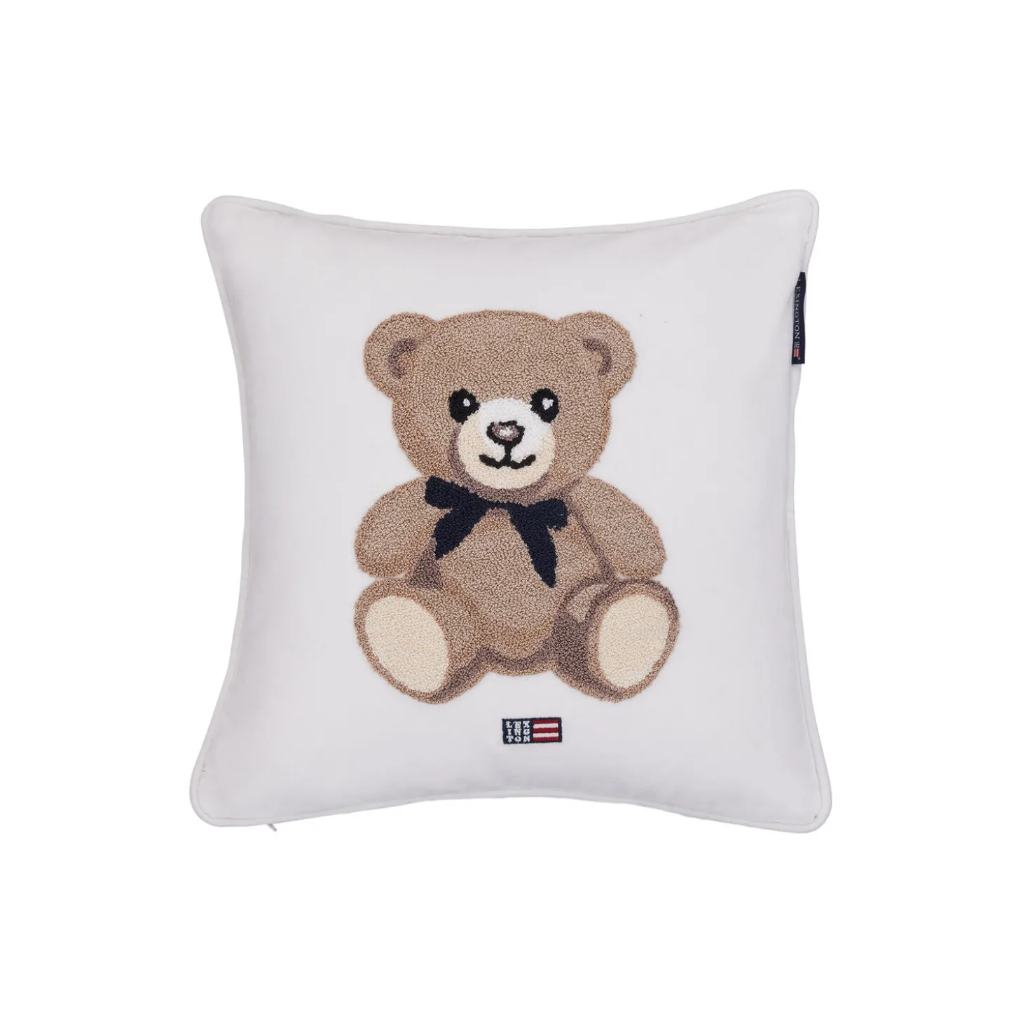 Denne pude er lavet af blødt økologisk bomuldsfløjl med matchende kantrør og har Lexingtons broderede bamse og et Lexington-logo.