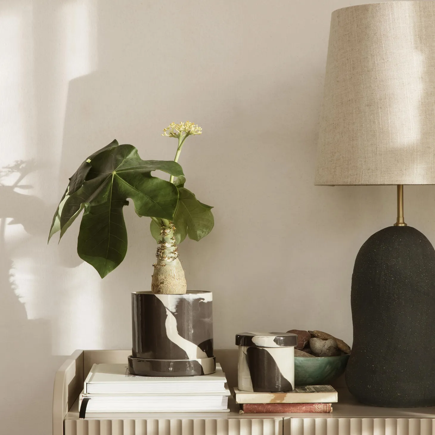 Inlay-serien er en kollektion af stentøj med en karakteristisk blanding af ler i to farvetoner, hvilket skaber et stort marmorlignende mønster, der er unikt for hvert stykke stentøj. En klar højglansglasur sikrer en glat finish. Denne universalbeholder kan bruges til opbevaring af alt fra tørvarer i køkkenet til kontorartikler på hjemmekontoret.
