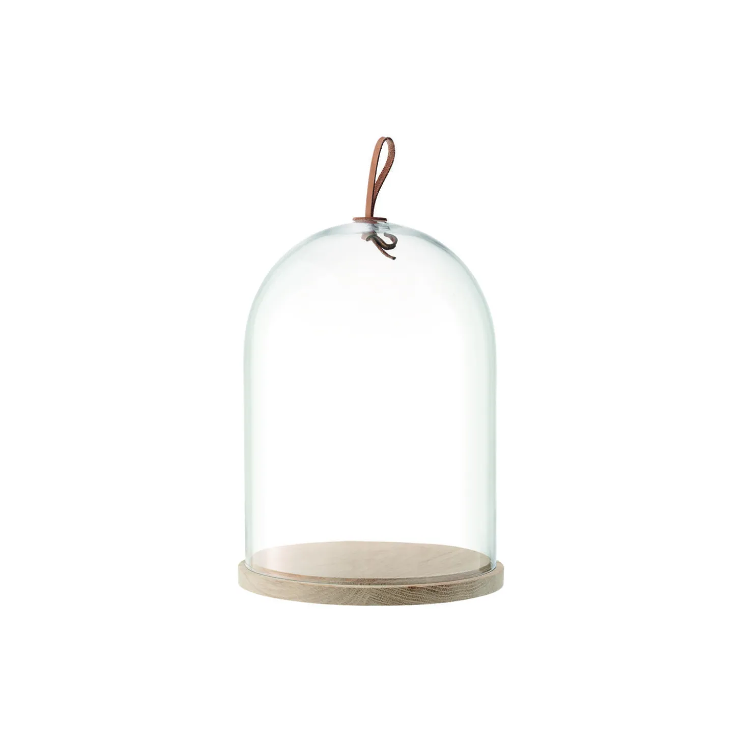 En høj mundblæst glaskuppel med læderhåndtag på naturlig træbund lavet af bæredygtigt aske. Designet til servering af kage, kiks eller ost.