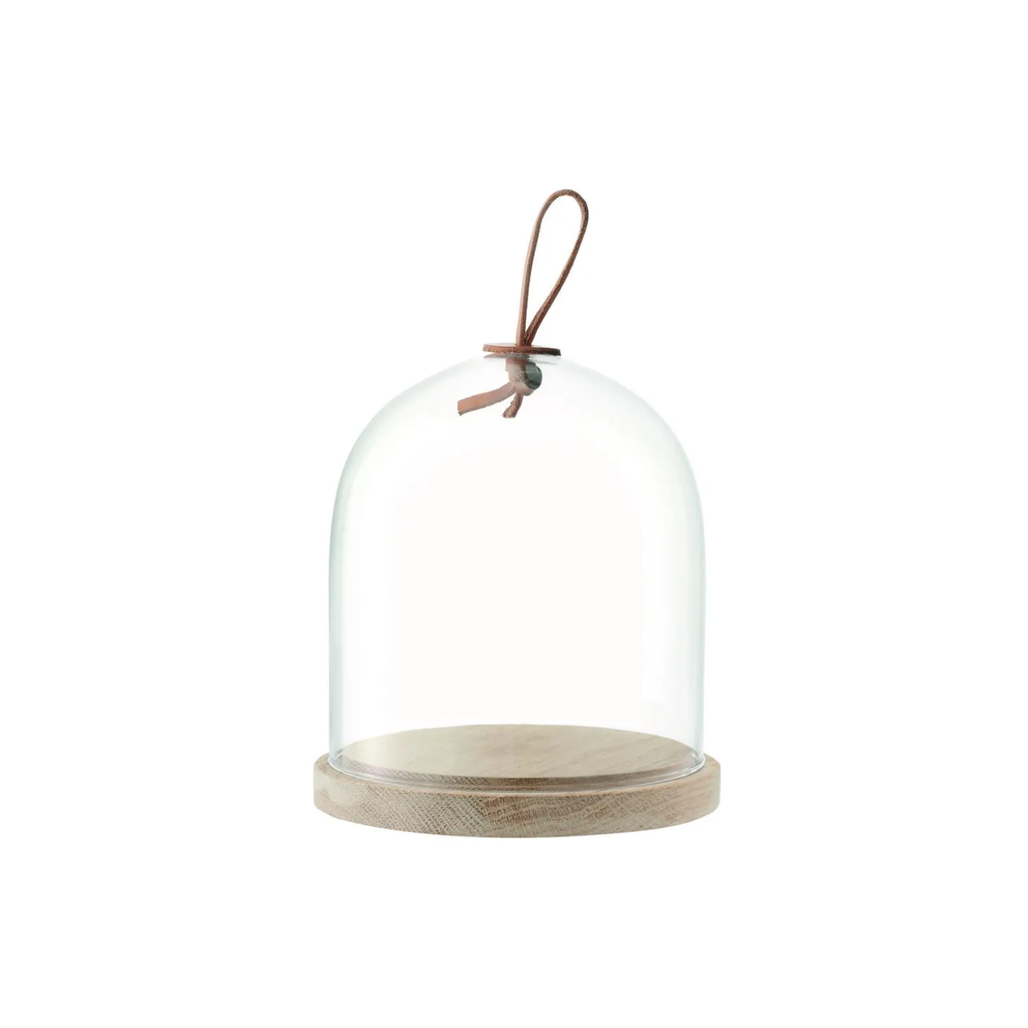 En lille mundblæst glaskuppel med læderhåndtag på naturlig træbund lavet af bæredygtigt aske træ. Designet til servering af en enkelt kage, kiks eller ost.