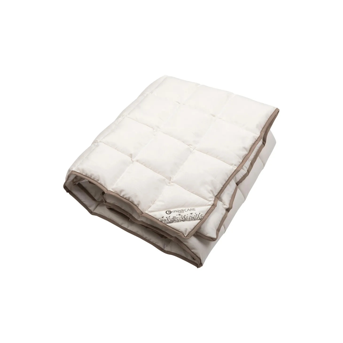Müsli kapokdynen er lavet af rene plantefibre og er perfekt til folk med allergier. Kapok udvindes fra frøene fra kapoktræet, og er en hul fiber som består af 80% luft. Luften som er fanget i fiberen giver kapokken en fremragende isoleringsevne, og gør den til en af de letteste plantefibre i verden. Kapok er dejlig luftig om sommeren og holder på varmen om vinteren. Derudover er hver kapok fiber betrukket med naturlig voks som afviser fugt, hvilket forebygger mug og gør dem perfekt til folk med støvmideallergi. •Lavet af rene plantefibre •Afvisende over for støvmider •Isolerende •Åndbar •Kan vaskes i maskine Mål 70 X 100 cm. Tog (Thermal resistance) 3,5. ADVARSEL! Sørg for at barnets hoved ikke bliver dækket til. ADVARSEL! Må ikke bruges i forbindelse med sovepose eller tæppe. Vær altid opmærksom på rumtemperatur og barnets påklædning, overophedning kan udsætte dit barn for fare. Holdes væk fra ild. Brug ikke dynen hvis den er ødelagt kasseres ved første tegn på brud. Babydyner anbefales til vugger og babysenge med mål fra 40*90 cm. Juniordyner anbefales til tremmesenge og juniorsenge fra 60*120 cm. Må IKKE renses kemisk. Sådan behandler du din Kapok dyne: Vask kun dynen hvis det er nødvendigt. Vi anbefaler, at du vasker dynen alene ved 40 grader for at skåne kapokfibrene. Brug et skånsomt vaskemiddel uden enzymer og blegemidler. Efter vask, kan du vælge ekstra centrifugering på 1200 omdrejninger, for at få slynget mest muligt, vand ud af produktet. Brug ikke skyllemiddel. Efter vask skal dynen straks tørres. Tør din kapokdyne alene i tørretumbleren, brug evt. vaskebolde for at hjælpe fyldet på plads under tørring. Du skal give dig god tid til tørreprocessen, da kapok tager tid at få tør. Tørretiden reduceres markant ved brug af tørre bolde, og sørger for at fibrene ikke klumper sammen. Vælg et 40 min. tidsprogram ved middelvarme. Kig til din dyne efter 40 min. brug hænderne for at fordele fyldet på plads, og gentag processen, indtil dynen er let fugtigt. Lad din dyne tørre et lunt sted indtil dynen er tør. Betræk 100% bomuld Fyld 100 % kapok (GOTS Organic Certified by Ecocert Greenlife Lic. No. 151714). Produktet er GOTS organic- certificeret, hvilket betyder at bomulden er certificeret økologisk, og at der i alle andre processer som farvning, strikning og syning er taget de strengeste hensyn til miljøet. GOTS er internationalt anerkendt som den førende standard for forarbejdning af tekstiler af økologisk bomuld. Derudover tages der også hensyn til arbejdsforholdene, hos dem der producerer tøjet. Kapok 53%, Økologisk bomuld 47%