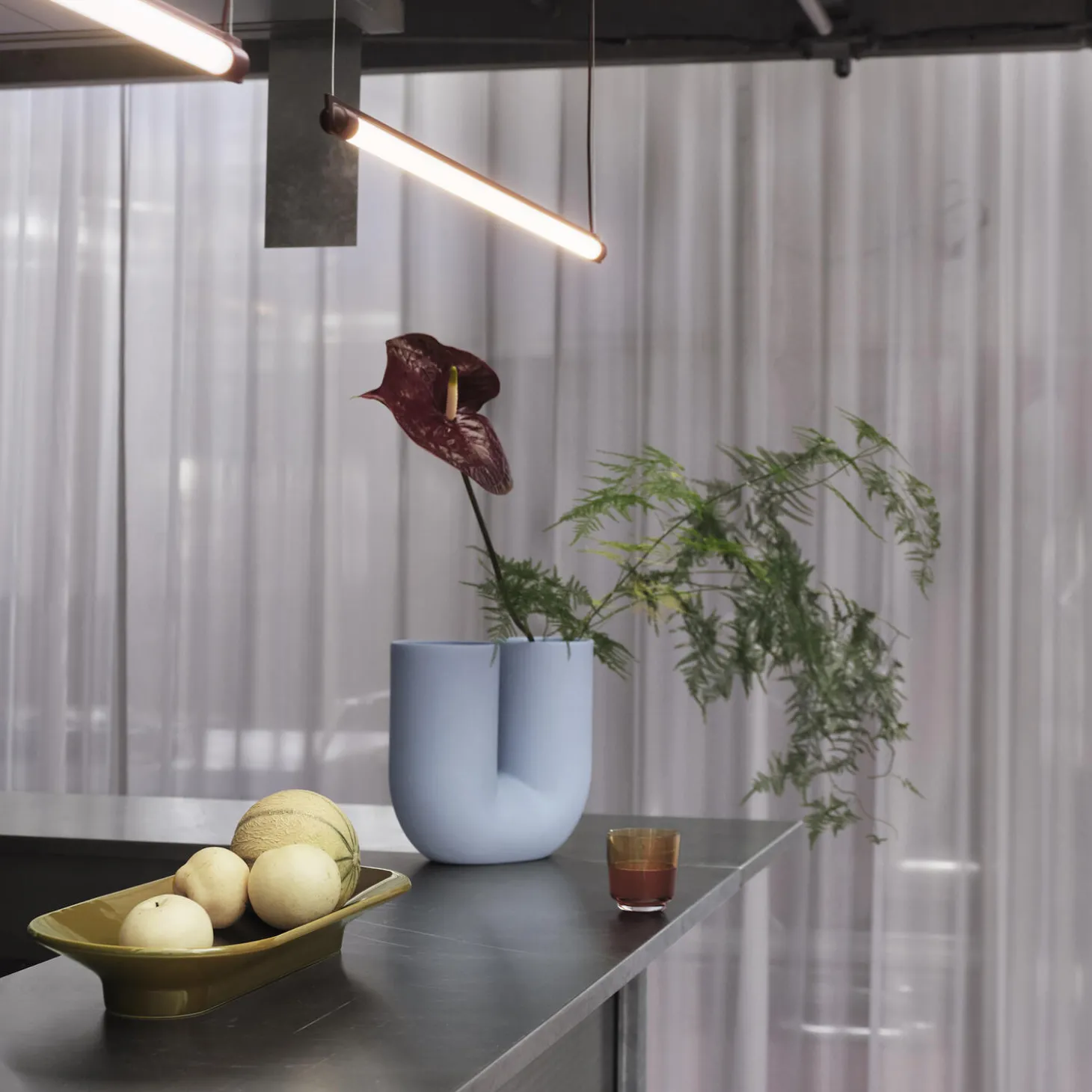 The Kink Vase brings a contemporary form to the archetypal flower vase through traditional craftsmanship and playful design language. With its double opening, the Kink Vase adds a sculptural sentiment to the room, even when not in use. The vase’s satin-glazed finish provides a refined, tactile feel that enhances its contemporary design. Available in two sizes, both are perfect for displaying flowers – use the larger Kink as a statement floor piece or sculpture, while the smaller size suits shelves, countertops, and windowsills.