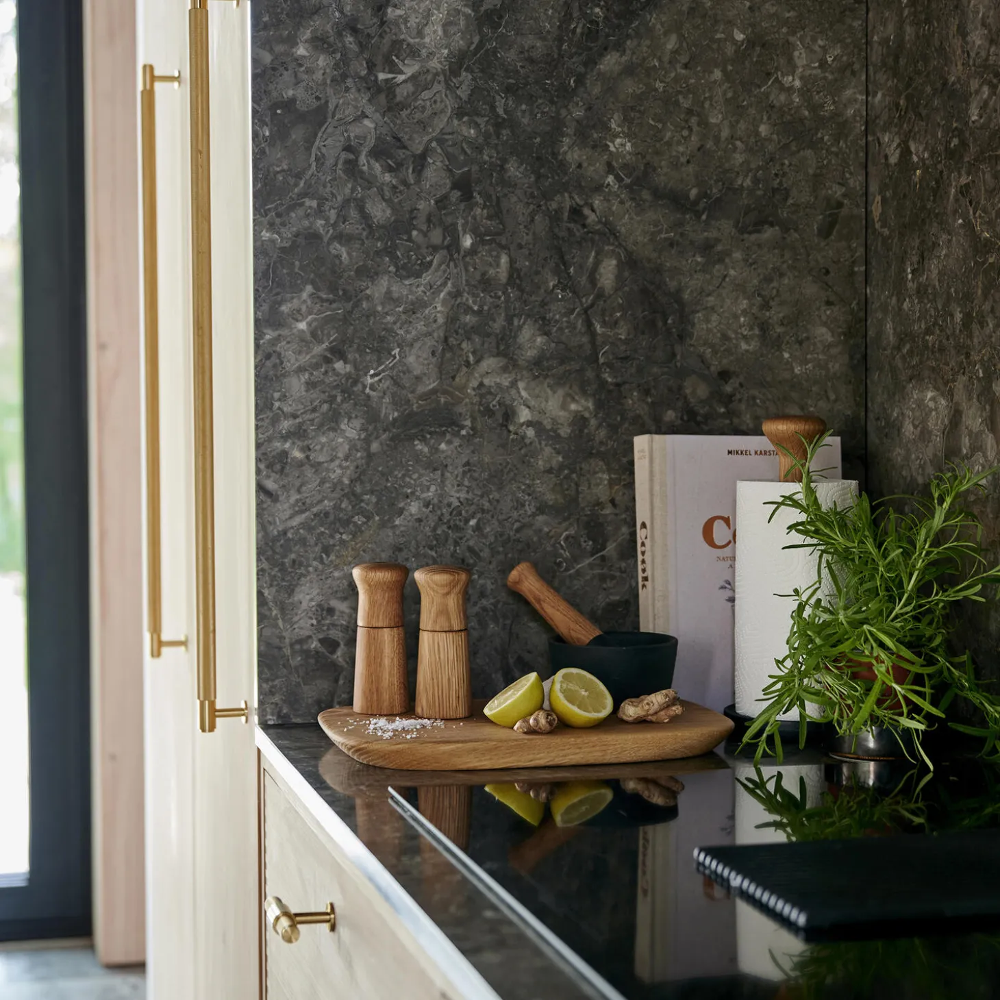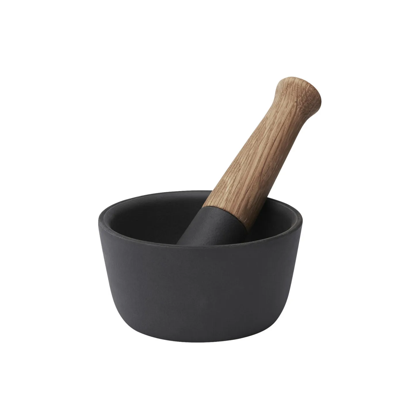 Funktionel morter i støbejern og eg. Designet passer smukt til saltkar og peberkværn. Støderen er 17,5 cm lang, mens skålen har en diameter på 12 cm og en højde på 6,5 cm. Rengøring med sæbevand anbefales, også inden brug første gang. Varen er produceret i FSC®-certificeret egetræ (FSC-C166612).