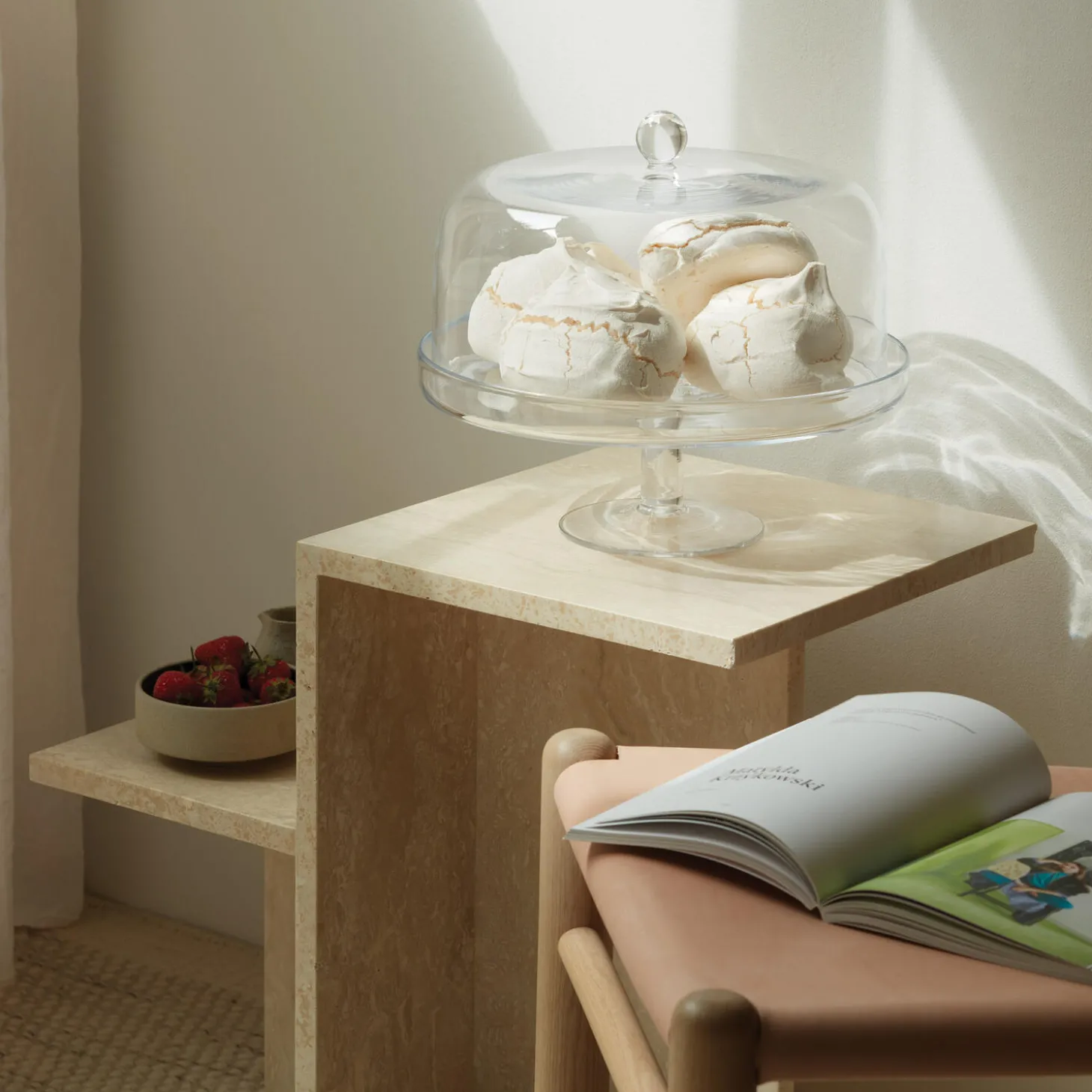 En stor mundblæst kagestand i glas med bred kuppel og kort tyk stilk. Designet til kager, bagværk eller petits fours.
