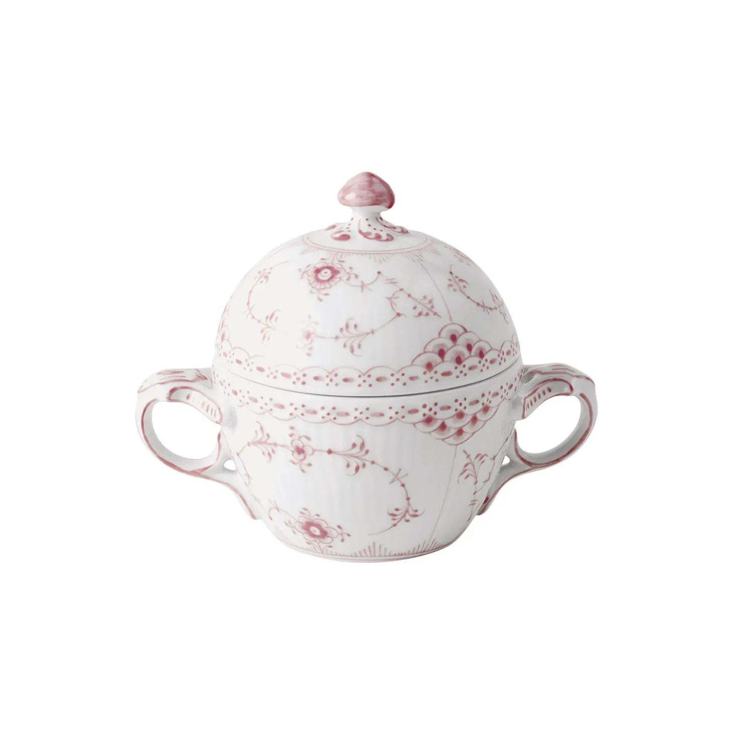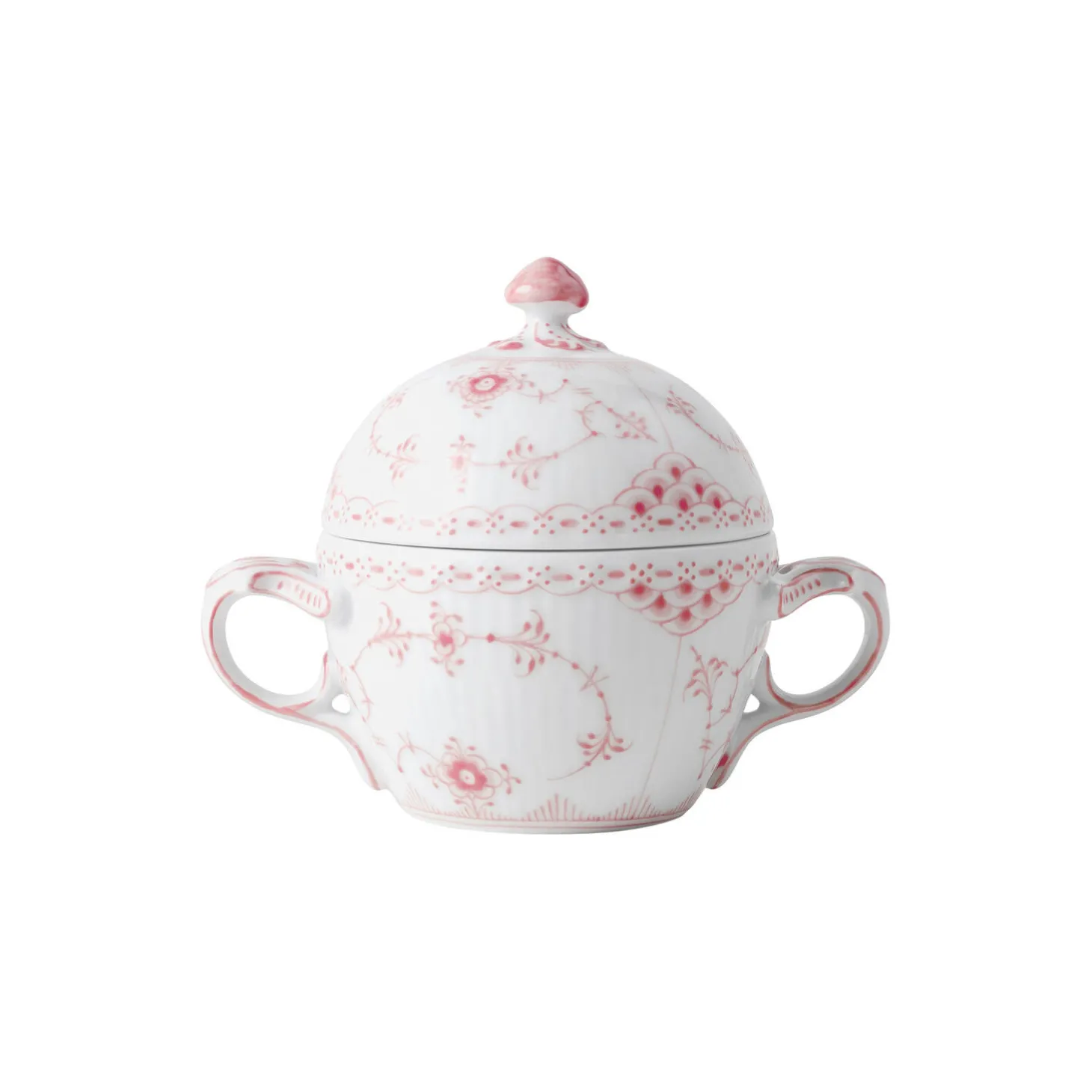 Koral Riflet Halvblonde sukkerskål er lige så charmerende som den er dekorativ. Den bløde koralnuance af blomsterdekorationerne tilføjer et strejf af romantik til dette stykke, som er en klassisk tilføjelse til ethvert bord. Håndmalet i indglasur teknikken og komplet med det karakteristiske sneglehuslåg , er dette et dejligt stykke for den moderne samler.