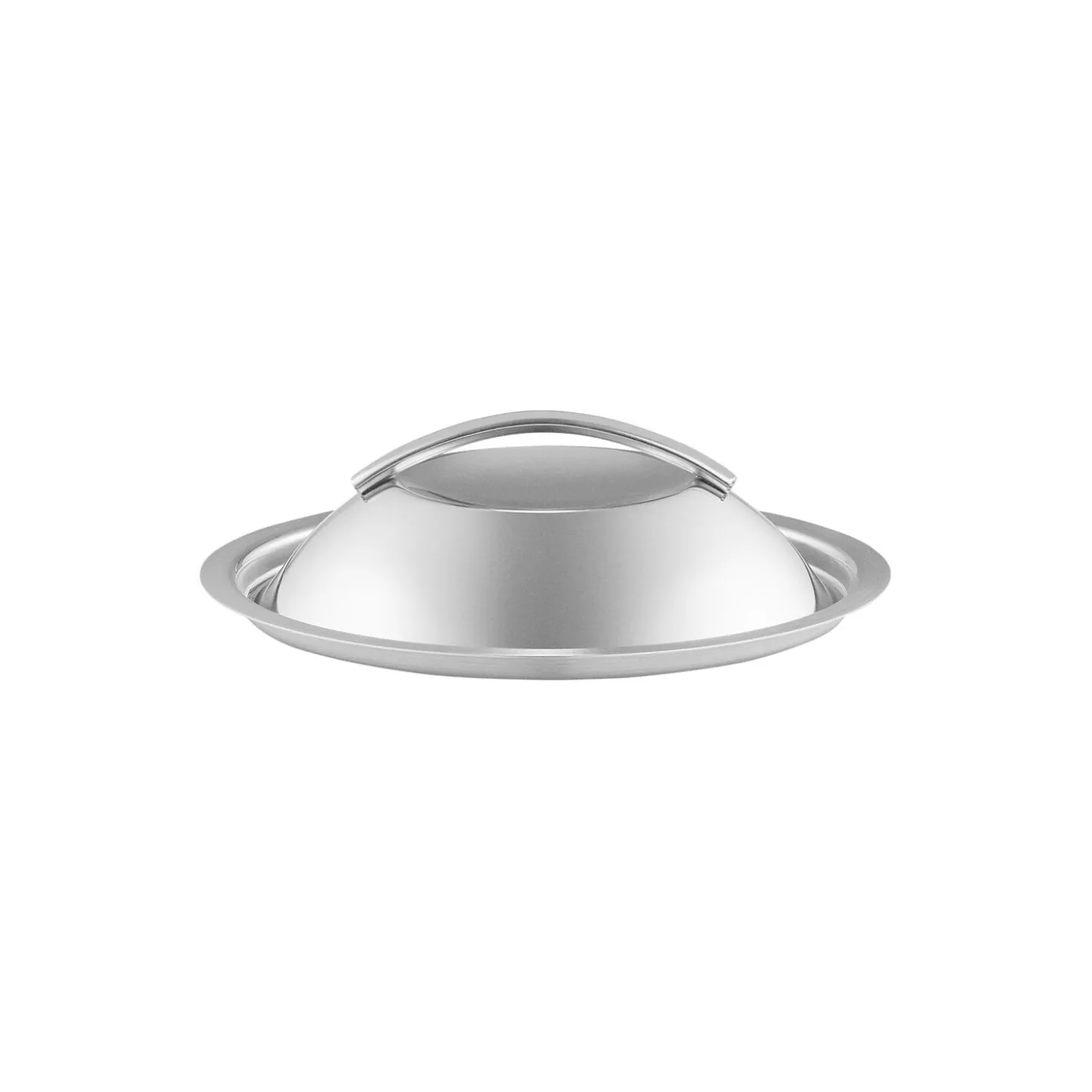 Kuppellågets buede form skaber ekstra plads i gryden eller panden, hvilket er perfekt til store ingredienser som en hel kylling, der ellers ville rage ud over kanten. Lågets design hjælper med at cirkulere varmen jævnt omkring maden, mens damp og kondens samles på indersiden og drypper tilbage, hvilket bevarer madens saft og kraft. Hoveddelen af låget er fremstillet af 90 procent genanvendt post-consumer stål. Alle gryder, pander og låg fra Eva Trio har faste størrelser, der kan stables og kombineres på tværs af modeller og materialer. Denne smarte løsning giver dig friheden til at vælge præcis det låg, du har brug for, samtidig med at det reducerer antallet af nødvendige låg. Eva Trio låg kan købes enkeltvis og tåler både ovn og opvaskemaskine.