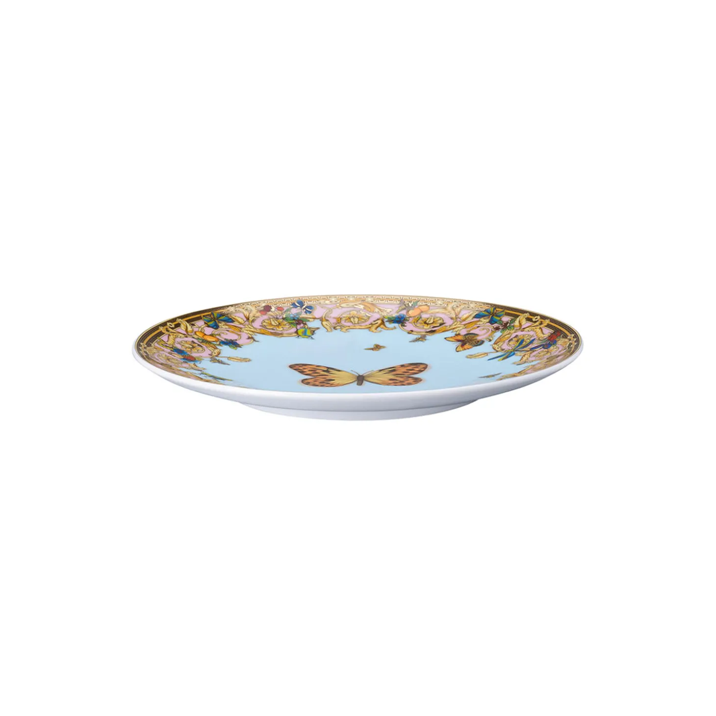 A small plate featuring the pastel tones and natural elements of the Le Jardin de Versace collection, accented with a delicate Greca border. This porcelain plate can be used to compliment dining arrangements or as a coffee table accent with the small square plate from the same line.