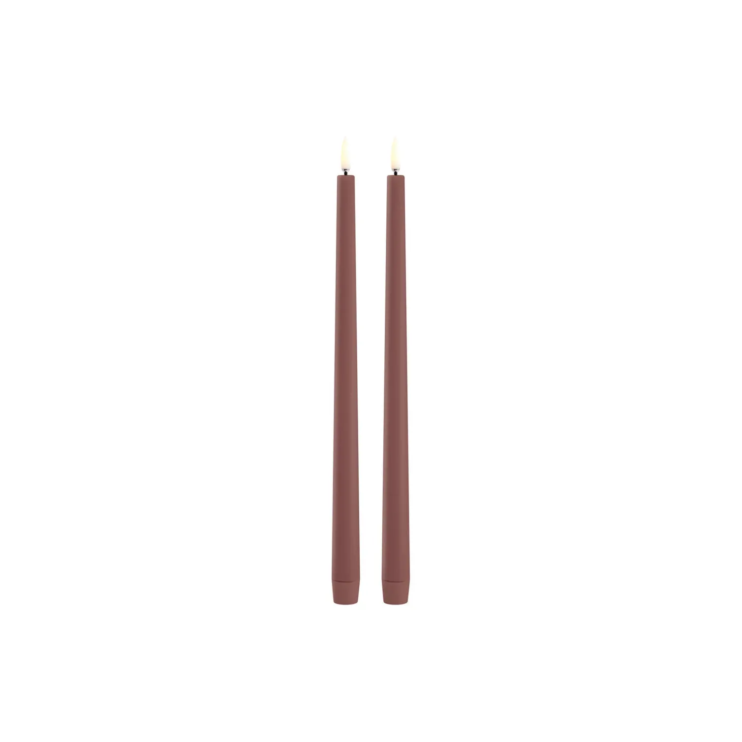 Slim Taper Candles have been meticulously crafted so that they gracefully taper towards the top, giving them an elegant and sophisticated appearance. Handmade from Virgin Paraffin Wax. Unscented. Two candles in pack. High quality realistic LED flame. Sizes may vary up to 2 mm. Indoor use: Direct sunlight and frost will damage the product. 200+ hours battery life. Batteries: 2 x AAA (not incl.). Built-in 6hr timer.