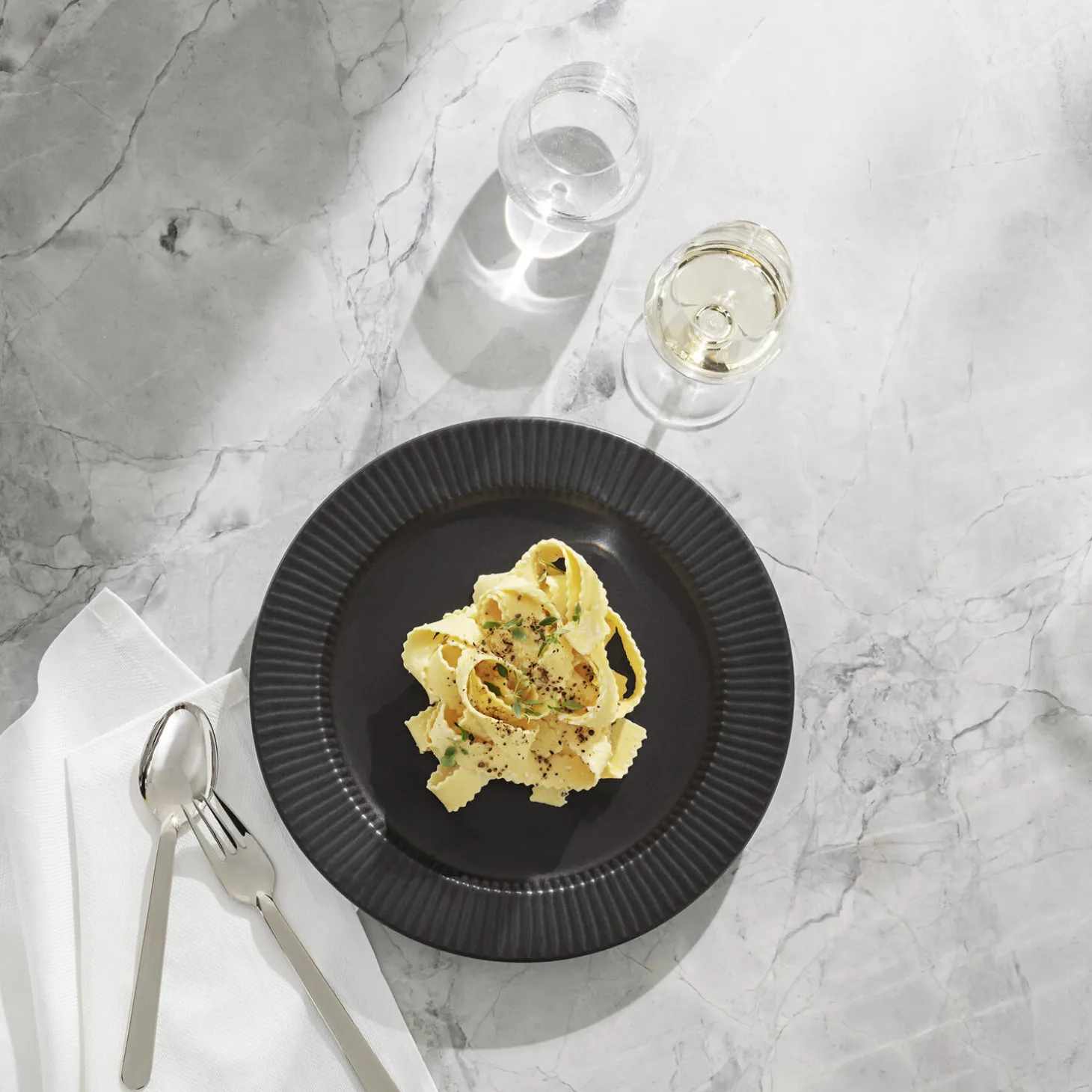 Dæk et smukt middagsbord med de elegante middagstallerkener, hvis rillede design indrammer og fremhæver maden. Legio Nova Black er en genfortolkning af det populære Legio Nova stel med en matsort finish inspireret af det rustikke, nordiske køkken. Med sit mørke farveunivers og de karakteristiske riller tilføjer stellet en spændende kontrast og dybde til enhver bordopdækning. Stentøjet er af højeste kvalitet og kan tåle alt fra ovn og fryser til mikrobølgeovn og opvaskemaskine. Legio Nova stellet er dækket af en 10-års garanti (scan QR-kode for mere information).