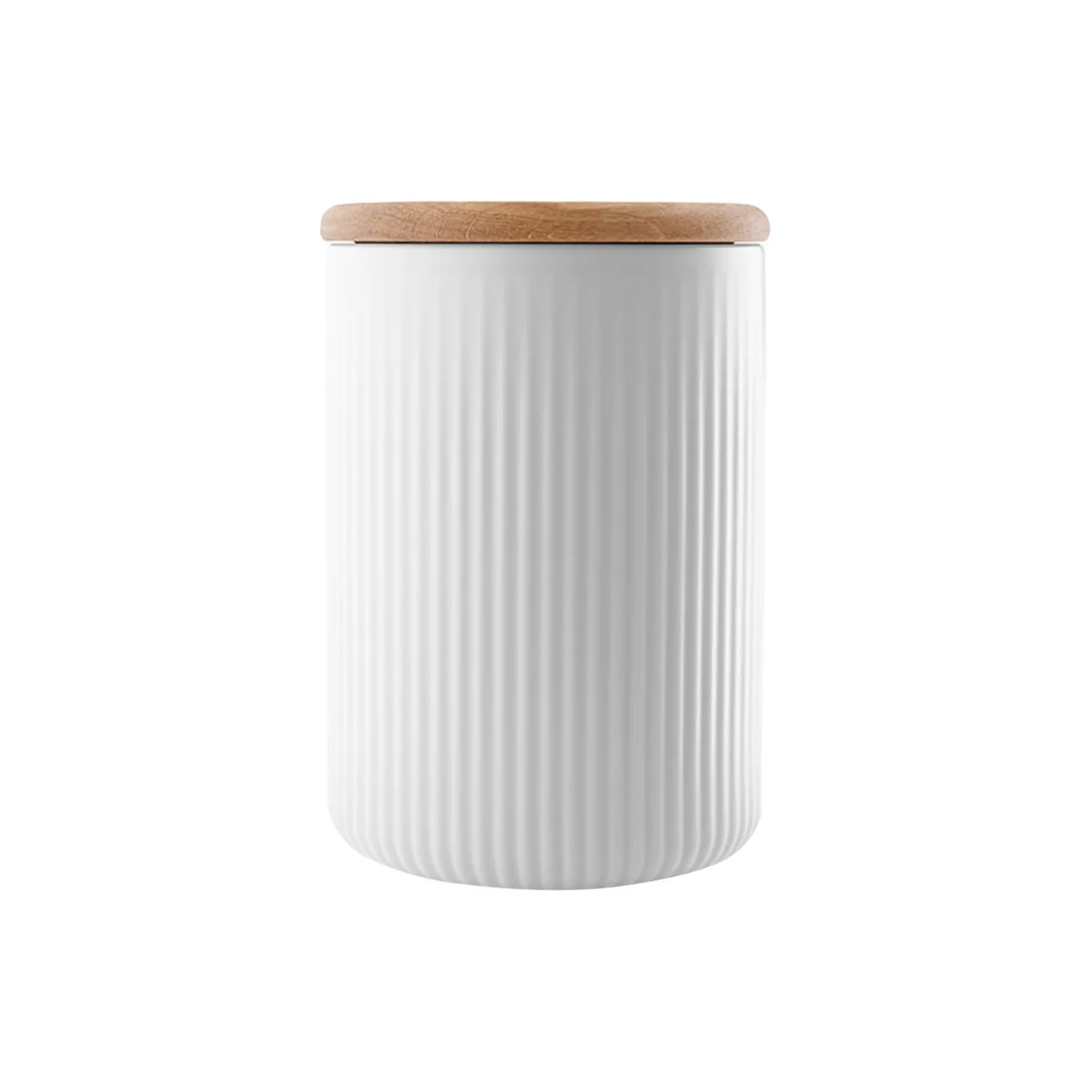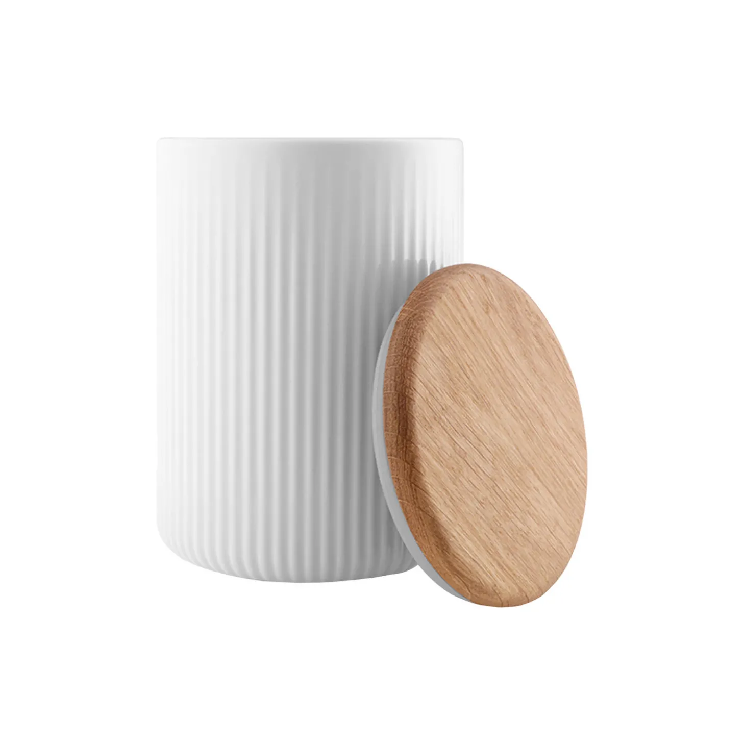 Få stilfuld orden i køkkenet med Legio Nova opbevaringskrukker. De gedigne egetræslåg og det lette riflede velkendte udtryk fra Legio Nova-serien pryder opbevaringskrukkerne og inviterer til, at man elegant kan samle hverdagens råvarer og stille frem på køkkenbordet eller hylden. En stilfuld måde at opbevare sukker, gryn og mel, som flittigt bruges i madlavningen. Opbevaringskrukken bevarer smag og konsistens, fordi låget slutter helt tæt. Krukken tåler maskinopvask, og låget rengøres let med en opvreÂdet klud.