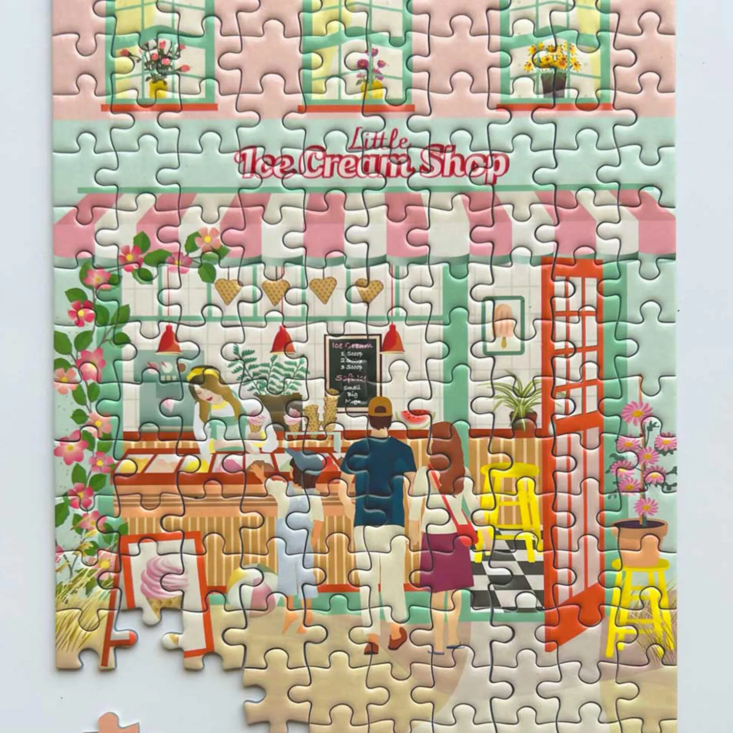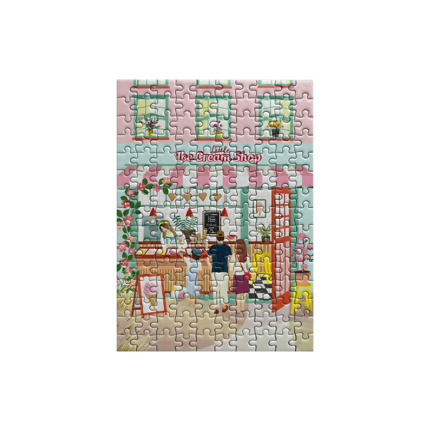 Det er varmt og det kan kun gå for langsomt med at få en is. Her i butikken kan du vælge mellem alle dine yndlingssmage. Hvad kunne du tænke dig? Vores lille puslespil med 150 brikker tager mellem 15 og 60 minutter at samle. Det giver dig en stund med ro og nærvær, når du har brug for det. Puslespillet indeholder små brikker og bør ikke komme i nærheden af børn under tre år.Puslespillet måler 15×21 cm. Spillet er FSC certificeret og lavet af C1S og Greyboard papir.