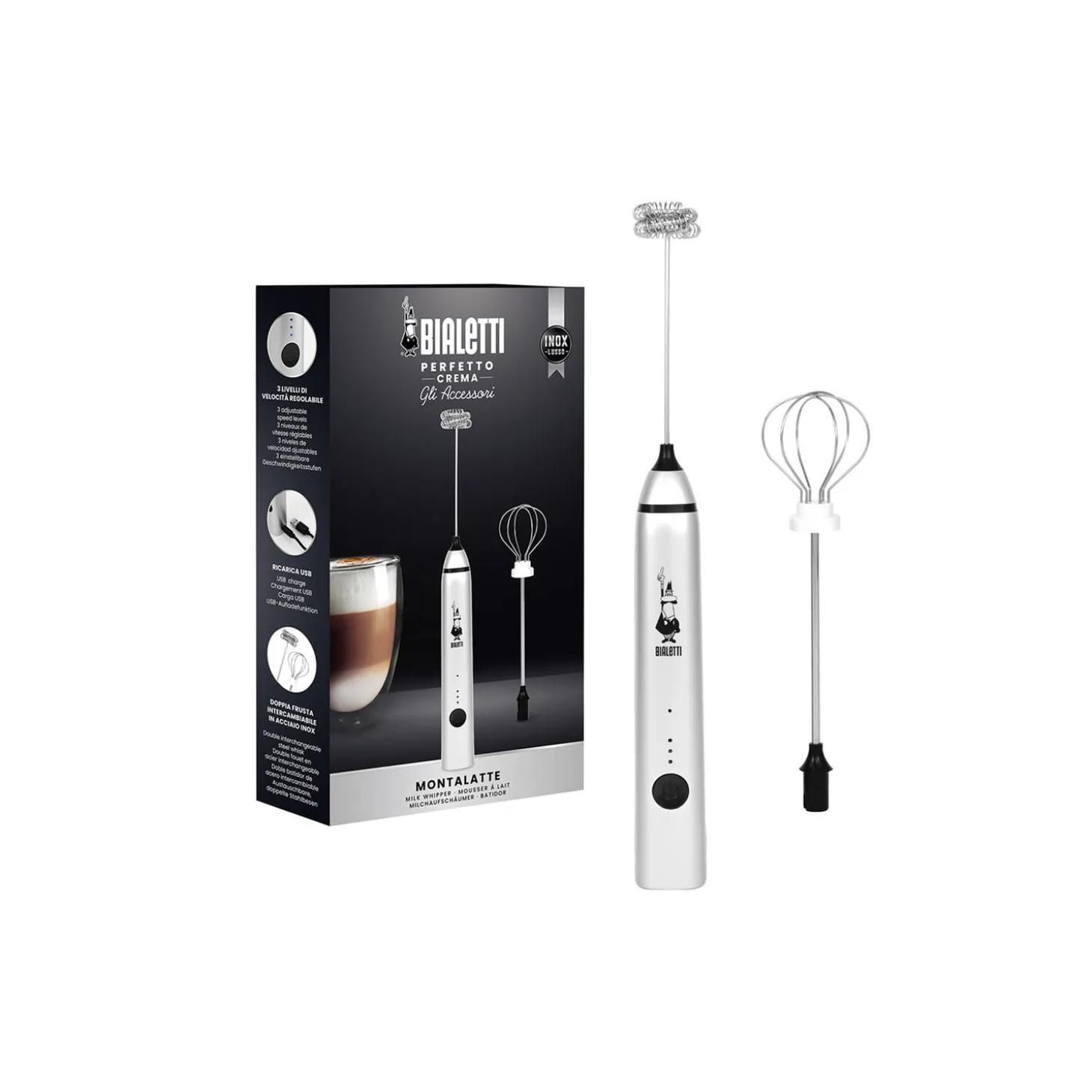 TRE HASTIGHEDSNIVEAUER, Skift hastighed efter ønske med en enkelt knap på håndtaget. USB-OPLADER, indbygget og let genopladeligt batteri. UDSKIFTELIGE PISKEHOVEDER, Afhængigt af tilberedningen kan du vælge enten det dobbelte piskeris eller ballonpiskeriset for at opnå de bedste resultater. GARANTERET RESULTAT, med mælk og de fleste vegetabilske drikke*. Den er også perfekt til at piske æg og lave proteinshakes, milkshakes, cocktails og smoothies.