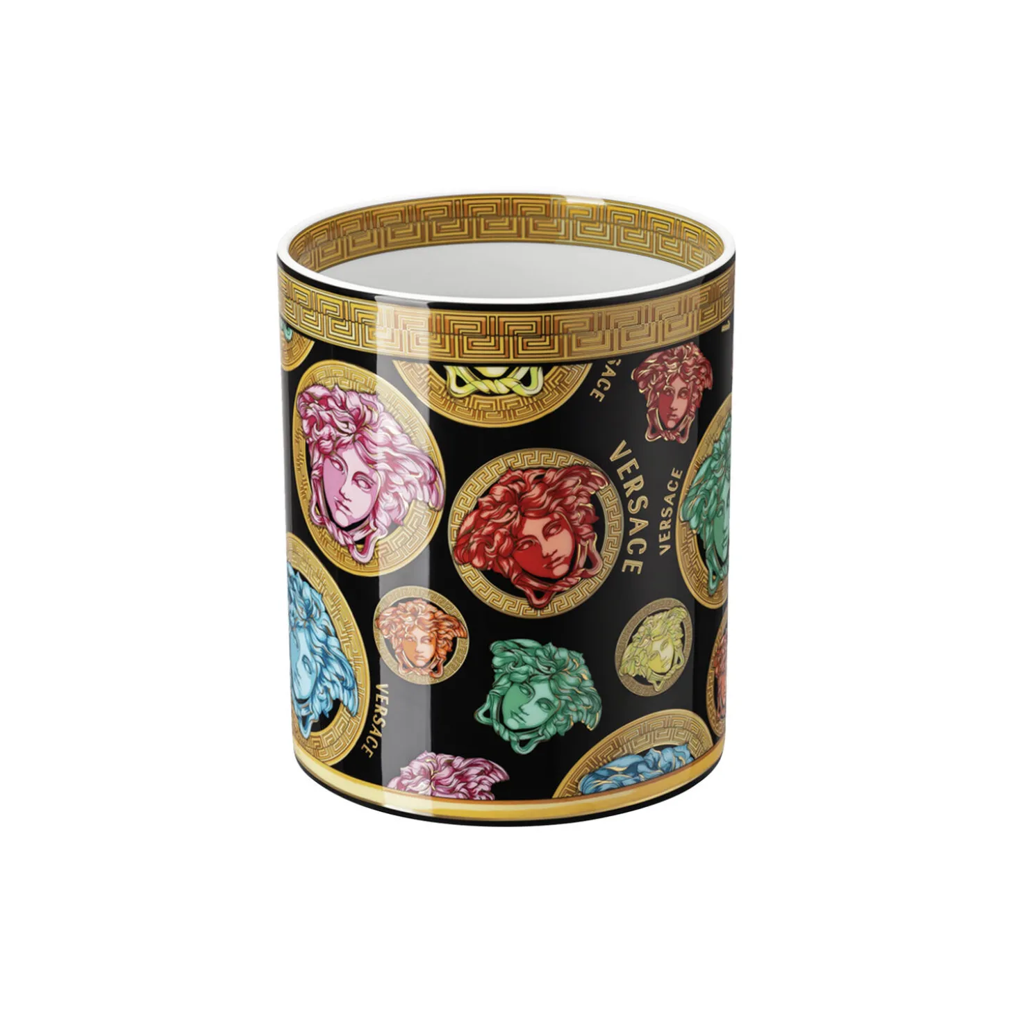 A multicolored porcelain Medusa Amplified vase with a Greca border motif.