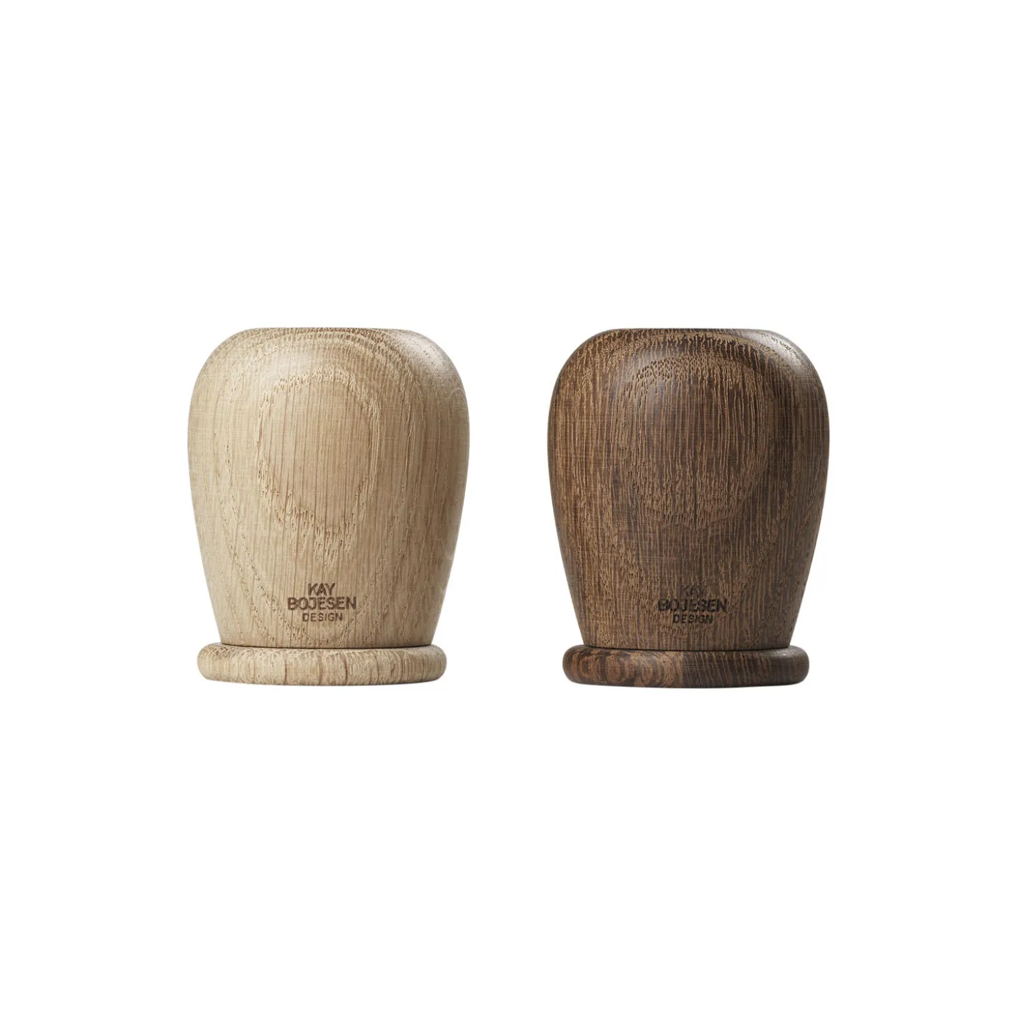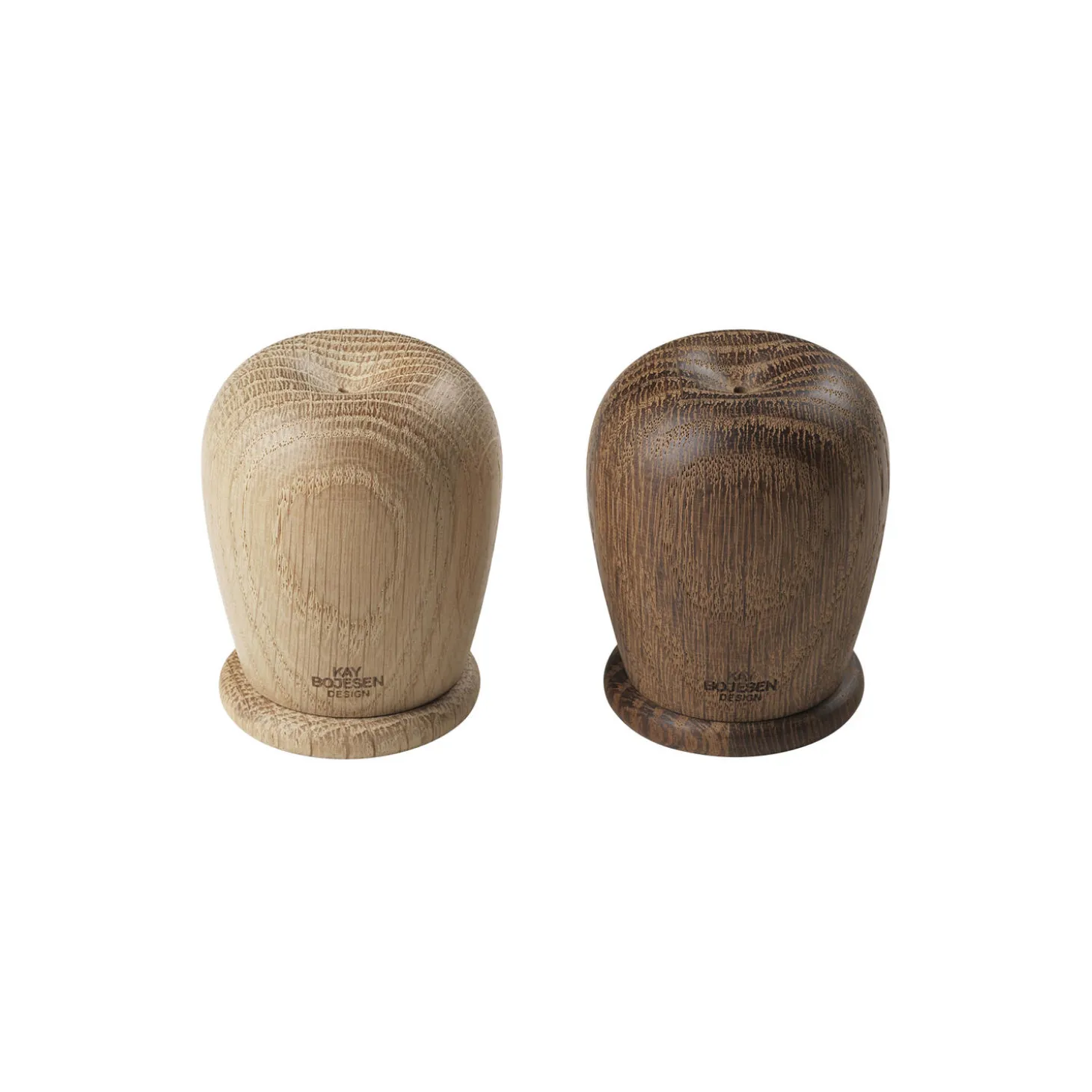 Elegant udformet salt- og pebersæt fra Kay Bojesen Menageri-serien. Sættet er drejet og sammensat af røget eg, der lader dig nyde træets smukke årer, som giver et skønt, unikt udseende. Træet har en fødevaregodkendt overfladebehandling, der gør det mindre modtageligt over for farveafsmittende fødevarer. Inspirationen til sættet kommer fra produkter til husholdningen designet af Kay Bojesen tilbage i 1940’erne, hvor han producerede smukke og anvendelige produkter i træ. OBS: Tåler ikke opvaskemaskine