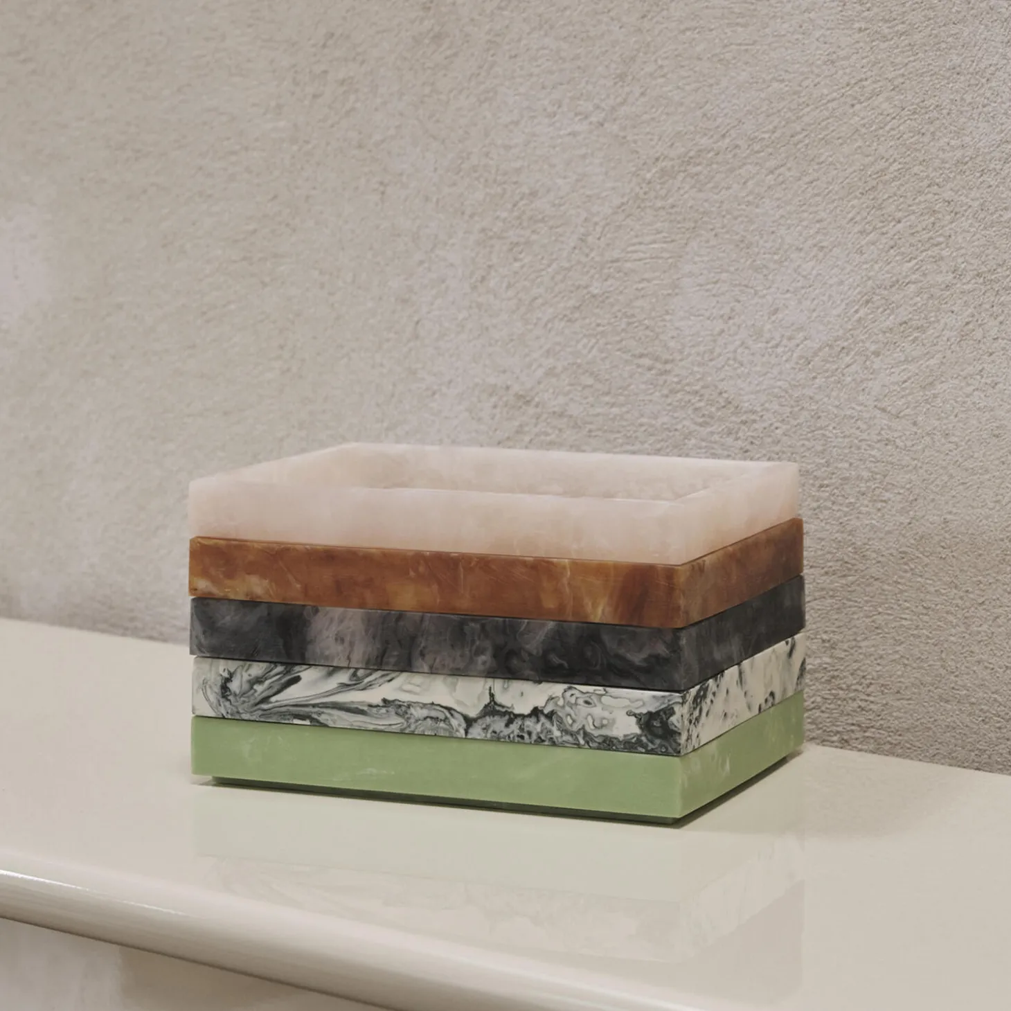 Mist serien er en sofistikeret blanding af legende geometri og funktionelt design. Alle dele i denne finurlige serie giver dig mulighed for at skabe din egen unikke kombination med indbyrdes forbundne former, som kan stables. Mist Bakken er fremstillet af en resinblanding og har flydende, hvirvlende former og æteriske toner, som gør hver enkelt bakke helt unik. Bakken er perfekt til at rumme plejeprodukter, tilbehør og andre skatte, og den passer nemt ind i alle hjemmets rum. Mist Bakken fås i forskellige størrelser, sælges separat og opfylder en række opbevaringsbehov i hjemmet med elegance og stil.