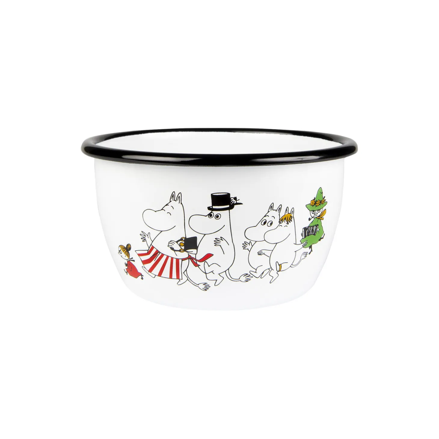 Fin emalje skål med en god størrelse på 6 dl. Der gør skålen anvendelig i flere sammenhænge. Skålen har motiv af en god del af Mumidalens beboere, mumifamilien der består af mumifar og mumimor og deres lille mumitrold samt vennerne lille My, mumrikken og snorkfrøkenen. Alle emaljeskåle udføres på fabrikker i Frankrig og hånd emaljeres i Kroatien. Muurla’s emaljeskåle har en blød kant teknik, hvor krusets skarpe kant er bøjet helt indad for at skabe en behagelig overflade at drikke af. Emaljeprodukterne består af en kerne af kulstofstål, der er dobbeltbelagt med emalje af høj kvalitet. Alle Muurla’s emaljeprodukter er opvaskemaskine sikre, men må ikke anvendes i mikrobølgeovne.