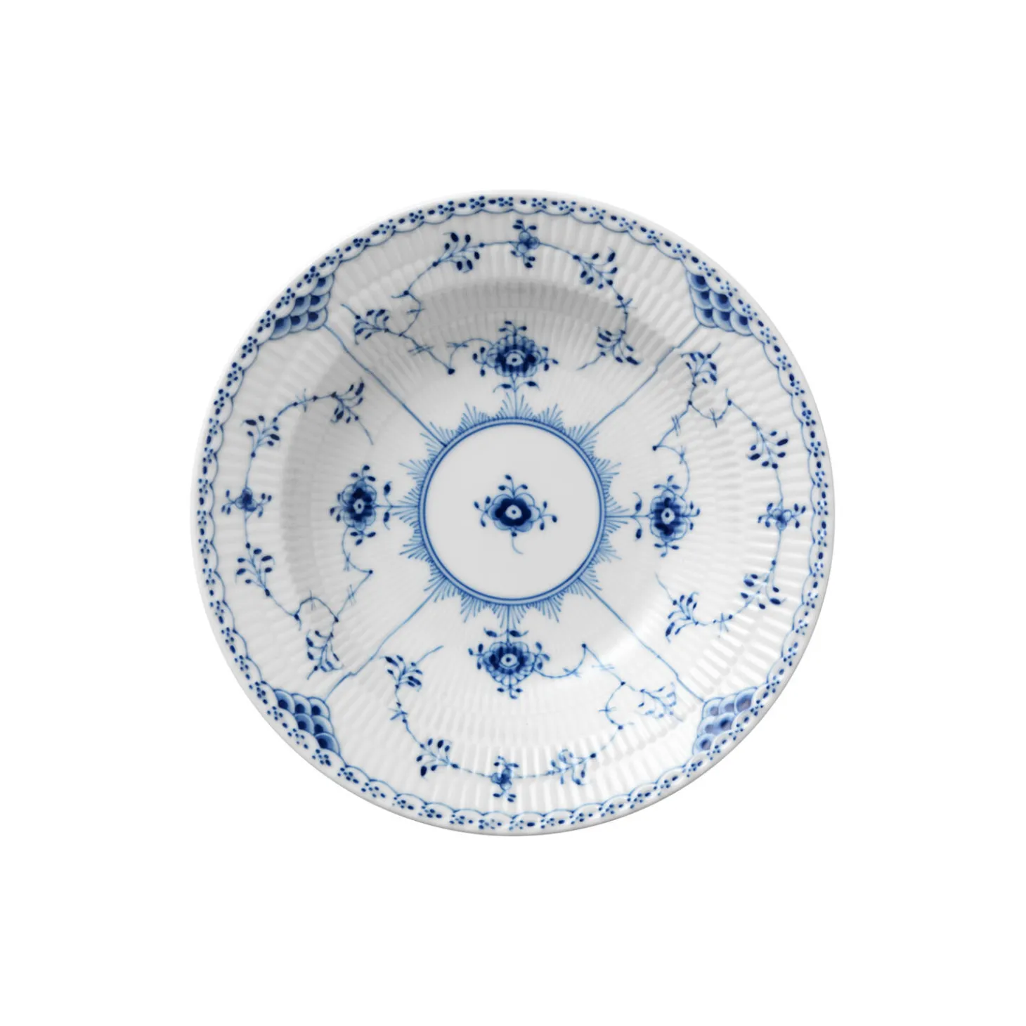 Musselmalet Halvblonde dyb tallerken i porcelæn fra Royal Copenhagen. Denne Musselmalet Halvblonde Dyb Tallerken med bred kant er håndmalet med det klassiske stels detaljerige, blå mønster, hvis elementer af blomster og palmetter breder sig over tallerkenens overflade. Den dybe tallerken på 21 cm tilfører et klassisk strejf til enhver borddækning, hvor den er nyttig til alle dagens måltider.