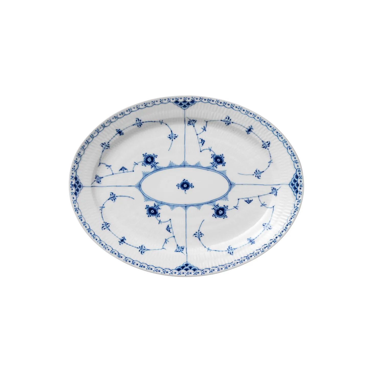 Musselmalet Halvblonde fad i porcelæn fra Royal Copenhagen. Musselmalet Halvblonde Fad på 36,5 cm er udsmykket med stellets klassiske mønster af en fin blondekant og håndmalede, blomstrende elementer. Blondekanten indrammer de fire felter af blå detaljer, som fortsætter ud på den riflede kant og skaber en dragende dybde i fadet, der pryder enhver borddæking. Fadet er smukt som et serveringsfad til mange typer af retter.