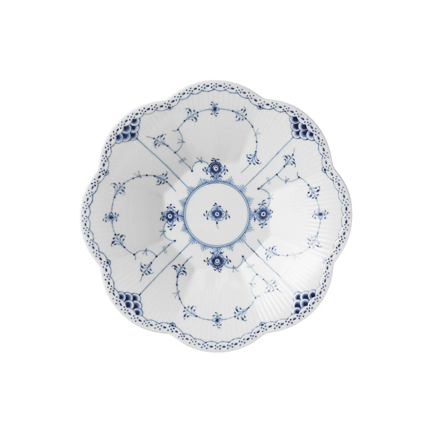Musselmalet Halvblonde kantet skål i porcelæn fra Royal Copenhagen. Med sine otte sider henleder denne Musselmalet Halvblonde skål tankerne på en blomst i fuldt flor. Skålen er håndmalet stellets klassiske mønster, der skaber et klassisk udtryk af blonder og florale elementer på skålens nutidige formsprog. Skålen på 25,5 cm er fin som en serveringsskål, men vil også gøre sig som et smukt element i ethvert rum i hjemmet.