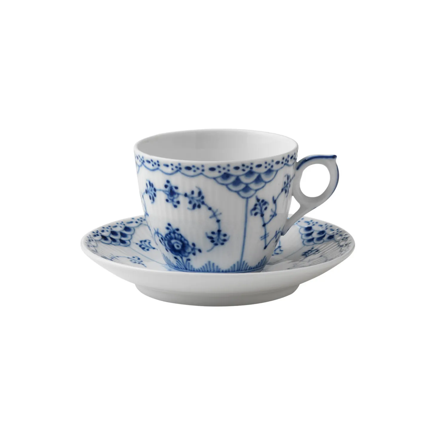 Musselmalet Halvblonde kop med underkop i porcelæn fra Royal Copenhagen. Denne kop med underkop på 17 cl har et klassisk formsprog, som på smukkeste vis komplimenteres af det tidløse, håndmalede mønster fra Musselmalet Halvblonde. Den delikate blondekant får følgeskab af stiliserede palmetter og smukke blomster, som giver et yndefuldt udtryk til kaffebordet.