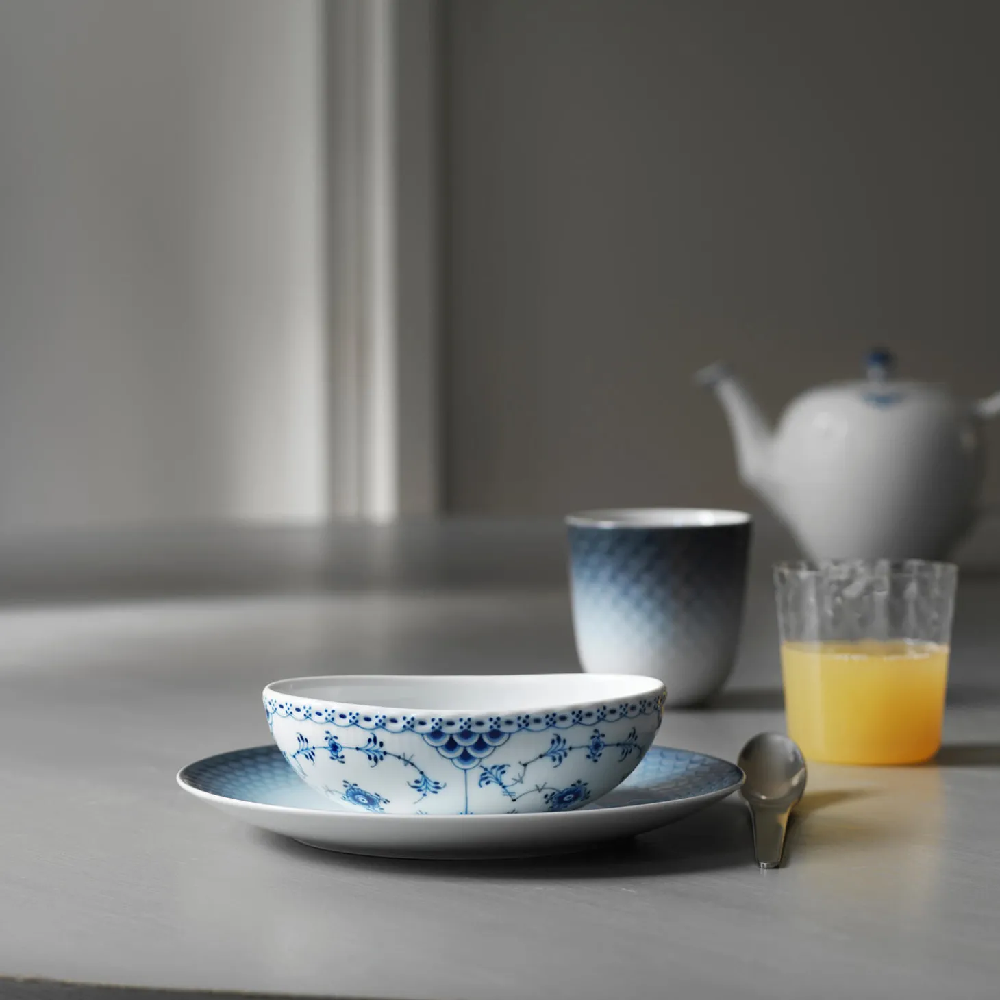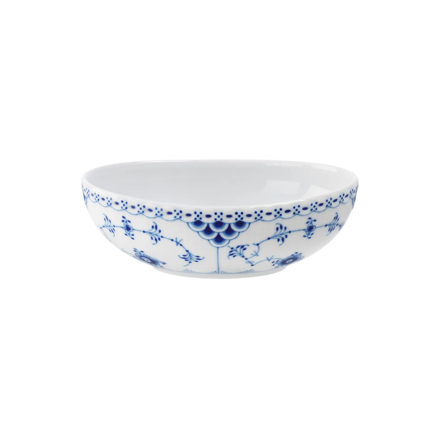 Musselmalet Halvblonde oval skål i porcelæn fra Royal Copenhagen. Musselmalet Halvblonde har eksisteret i mere end 130 år og er med sin rige bemaling og romantiske blonde et af Royal Copenhagens mest klassiske stel. Men et klassisk stel med en vidunderlig alsidighed: Oplev hvordan formen på den ovale skål er tilpasset moderne serveringer eller små kreative anretninger, mens designudtrykket er genkendeligt og evigt.