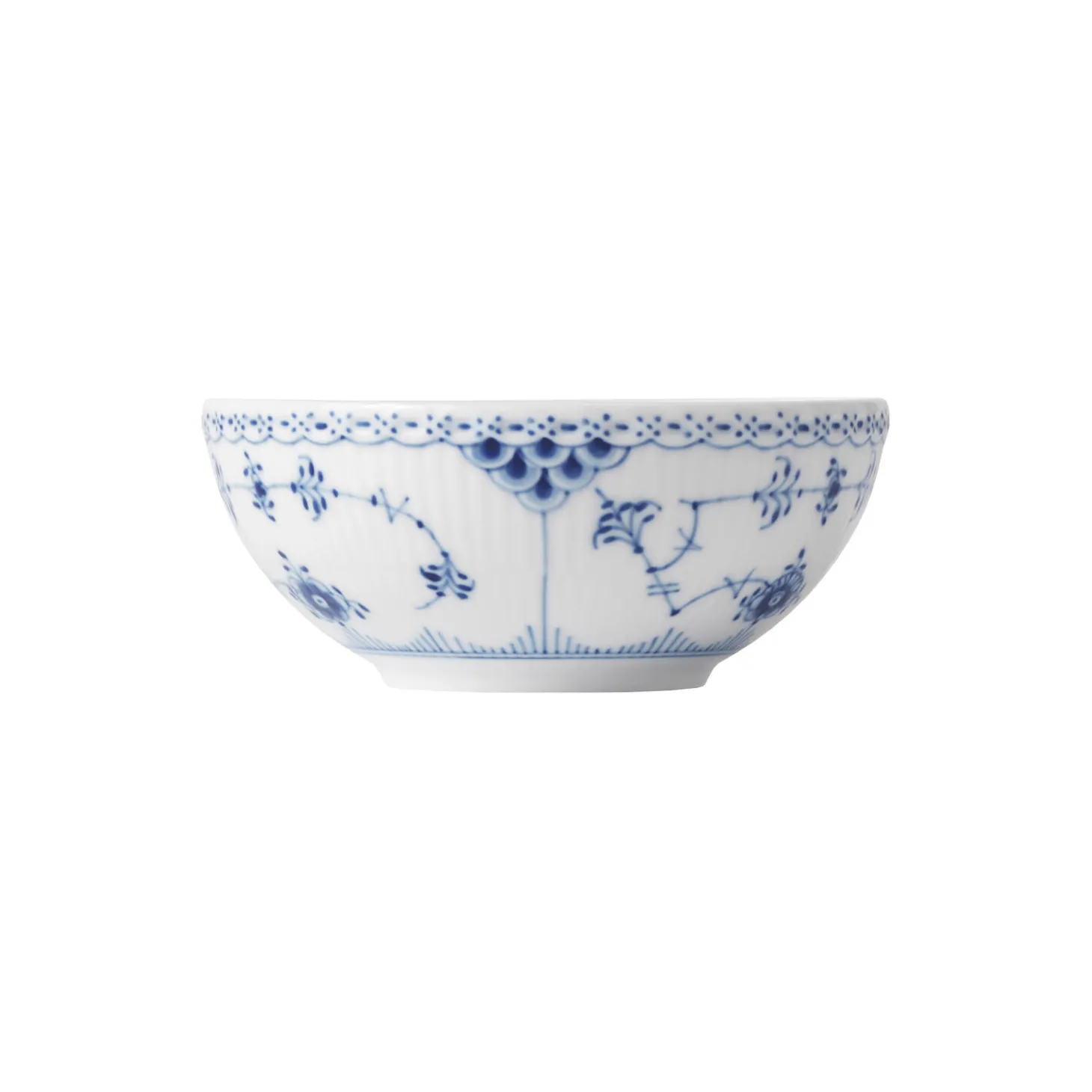 Musselmalet Halvblonde skål i porcelæn fra Royal Copenhagen. Denne Musselmalet Halvblonde Skål danner rammen om et smukt bord med sit klassiske, håndmalede blomstermønster, som pryder skålens yderside. Skålens kant er dekoreret med en delikat blonde, der er udskåret i hånden for derefter at blive dekoreret med blå penselstrøg. Porcelænsskålen rummer 50 cl.