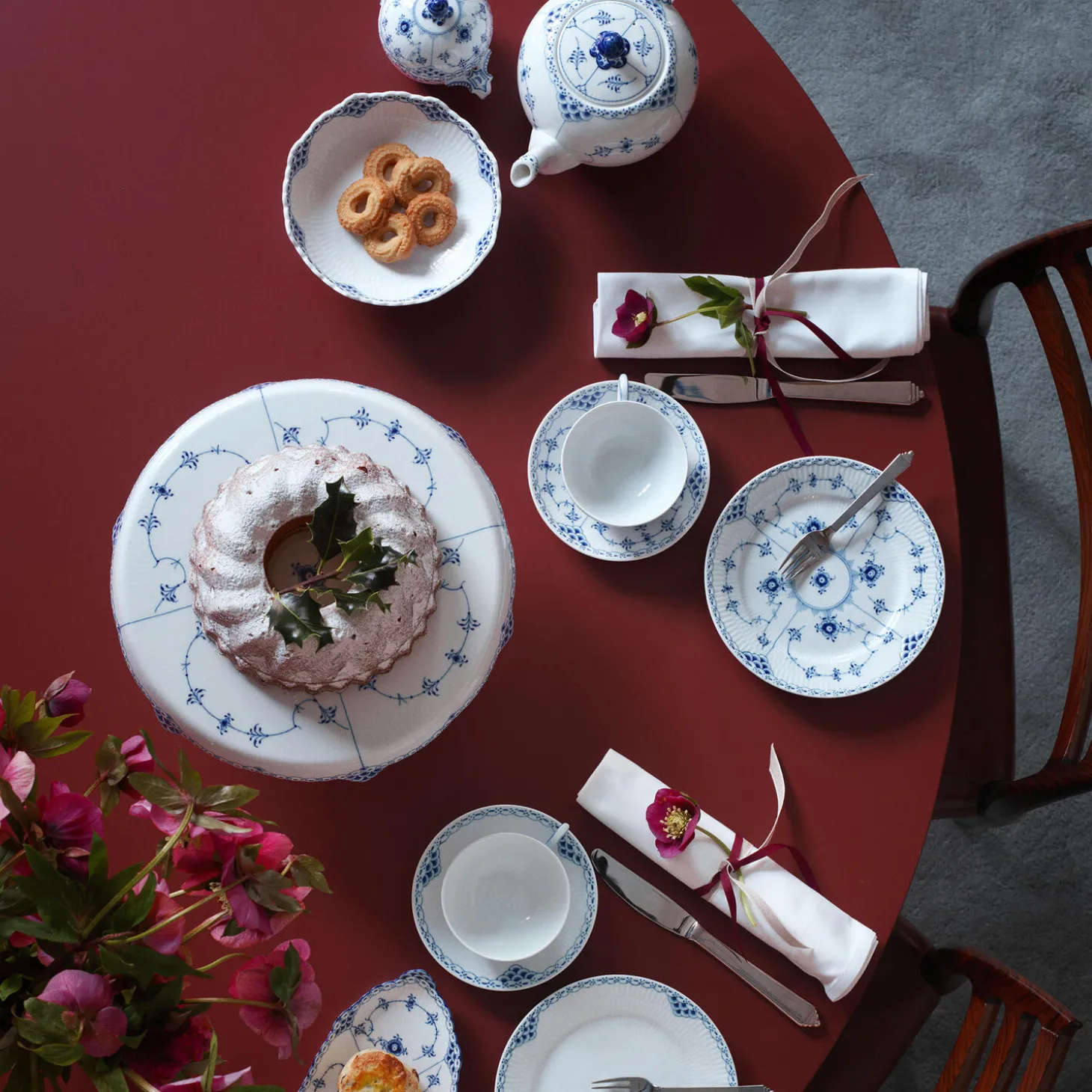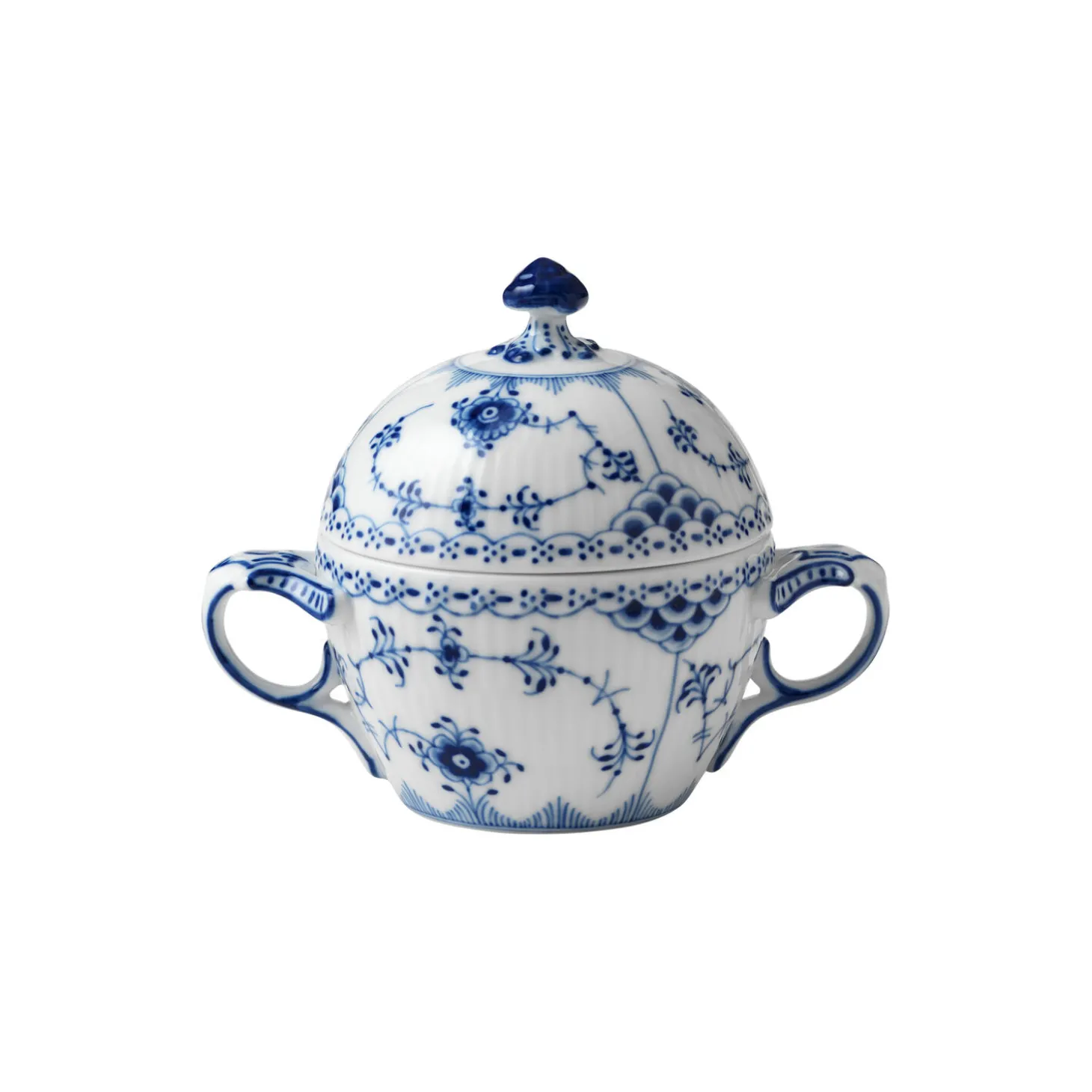 Musselmalet Halvblonde sukkerskål med låg i porcelæn fra Royal Copenhagen. Den charmerende sukkerskål i det håndmalede mønster fra Musselmalet Halvblonde er en smuk lille serveringsskål, der også er smuk i sig selv som et dekorativt element i dit hjem. Det fængslende mønster pryder hele skålen, og selv de symmetriske håndtag er rigt dekoreret med blå penselstrøg. Skålen rummer 20 cl.