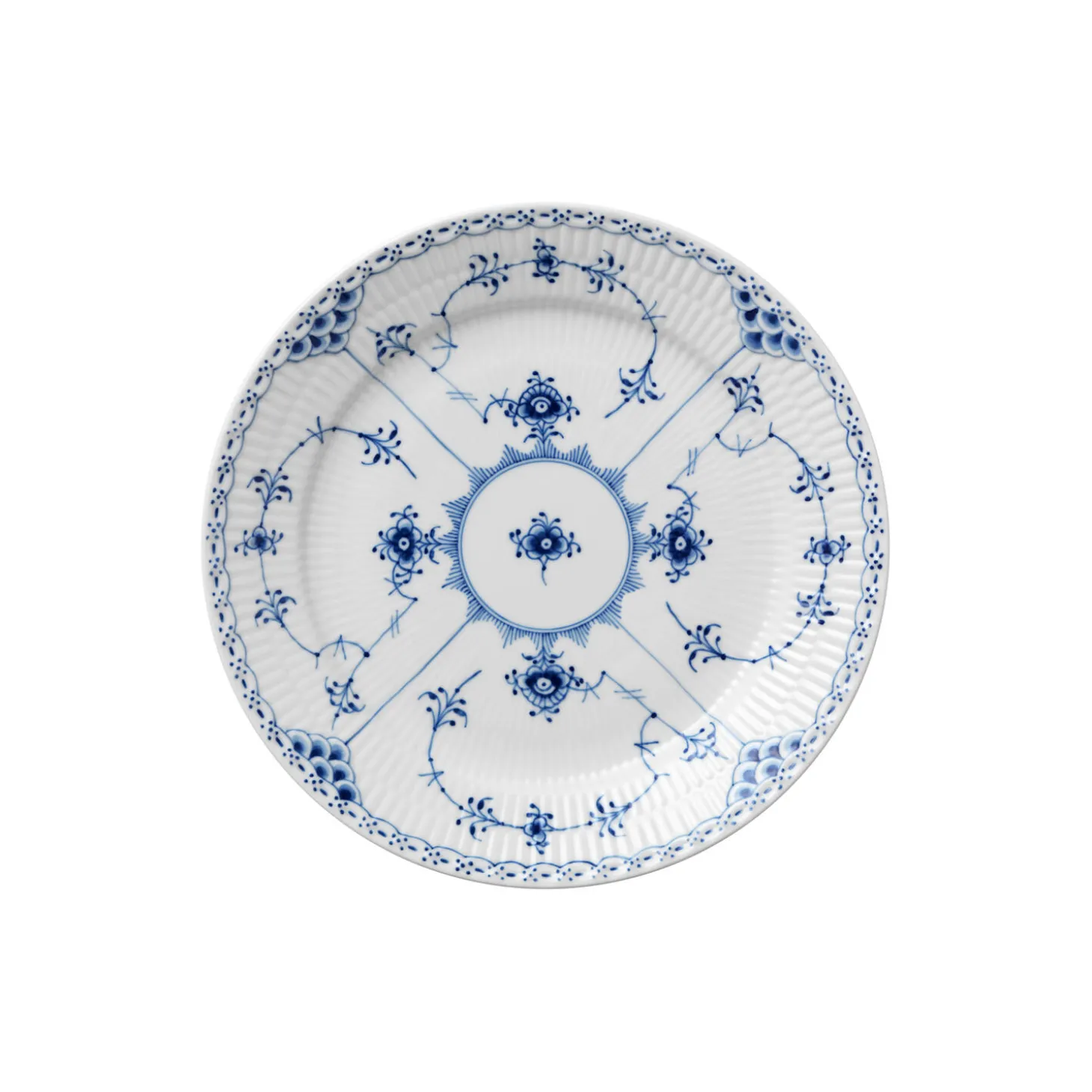 Musselmalet Halvblonde middagstallerken i porcelæn fra Royal Copenhagen. De hvide rifler danner en smuk baggrund til det håndmalede mønster af stiliserede blomster og palmetter på denne Musselmalet Halvblonde Tallerken på 25 cm. De florale elementer og den romantiske blondekant står elegant i enhver borddækning, hvor tallerkenen er nyttig som middagstallerken eller en stor frokosttallerken.