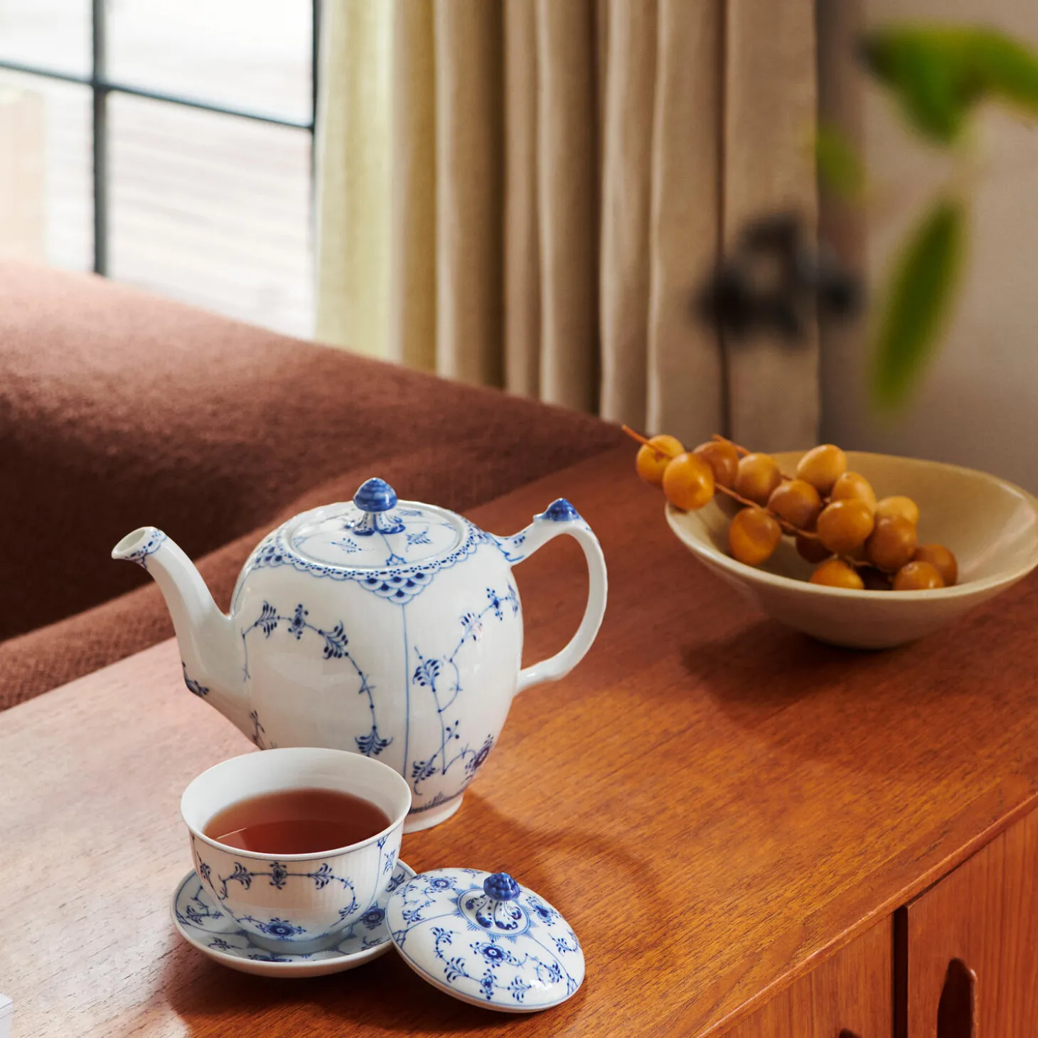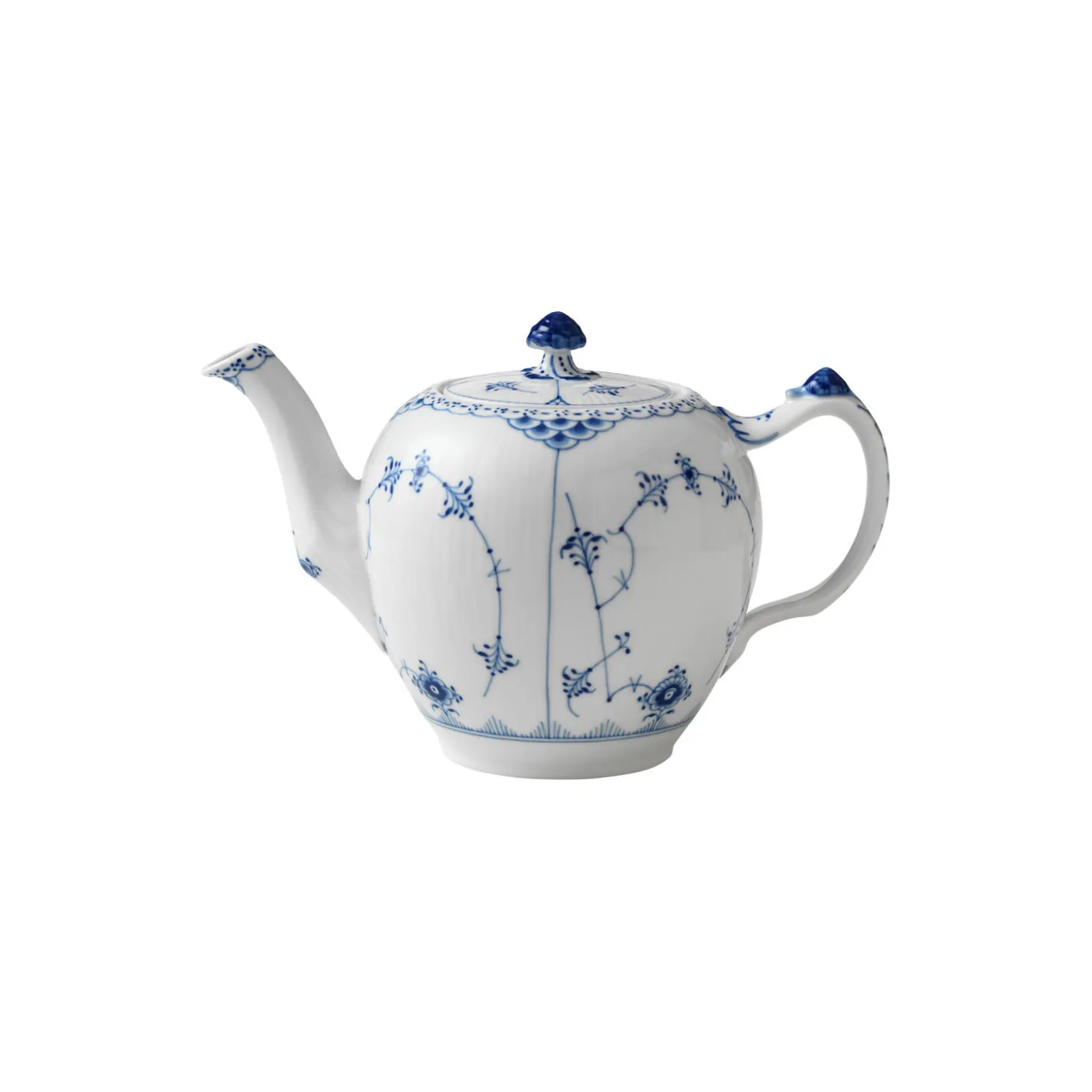 Musselmalet Halvblonde tekande i porcelæn fra Royal Copenhagen. Tilføj et strejf af elegance til din te-stund med denne håndmalede Musselmalet Halvblonde Tekande. Blå blonder og fine penselstrøg indrammer de stiliserede palmetter og blomster som fortsætter ud på porcelænskandens tud og hank, der også er dekoreret med en lille snegl. Tekanden på 100 cl skaber et klassisk tebord og er perfekt til te for to.