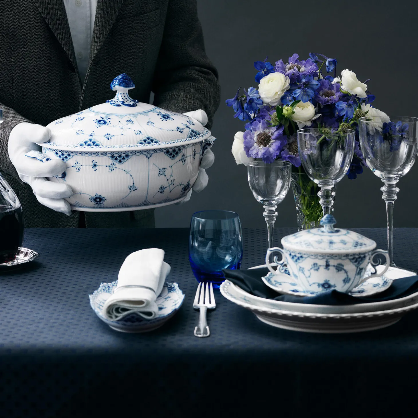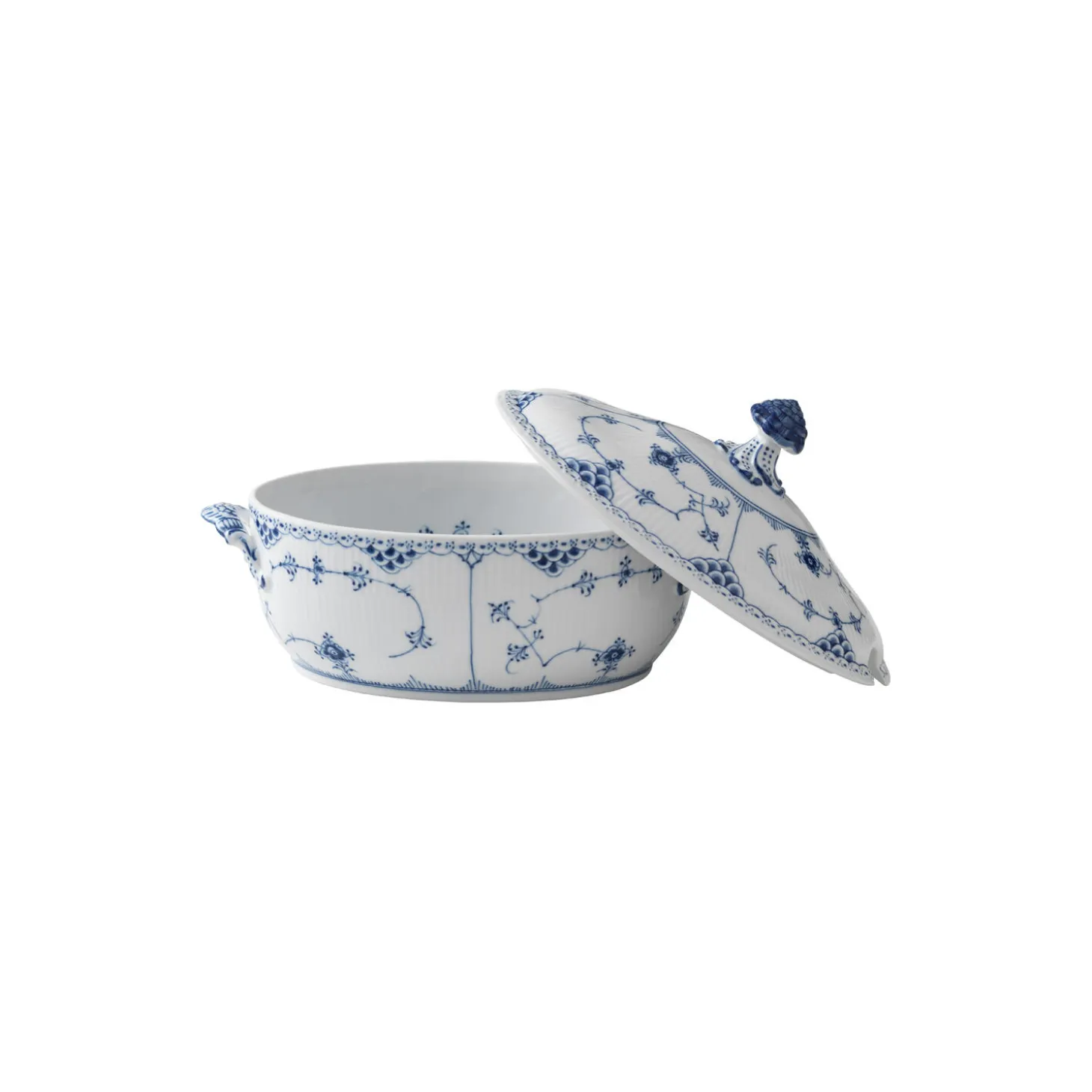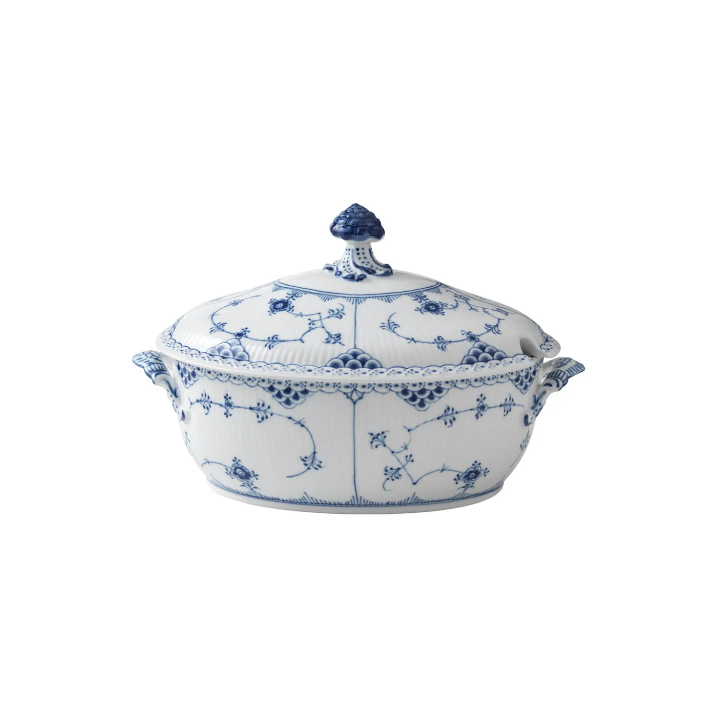 Musselmalet Halvblonde terrin med låg i porcelæn fra Royal Copenhagen. Med sit detaljerige, håndmalede mønster er denne terrin med låg en iøjefaldende serveringsskål til suppe, punch eller endda koldskål. Fra det blå sneglehus på låget udspringer blå stråler, der fortsætter ned ad skålens sider i et klassisk mønster. Terrinen rummer op til 200 cl, og i låget er et lille hul til suppeøsen.