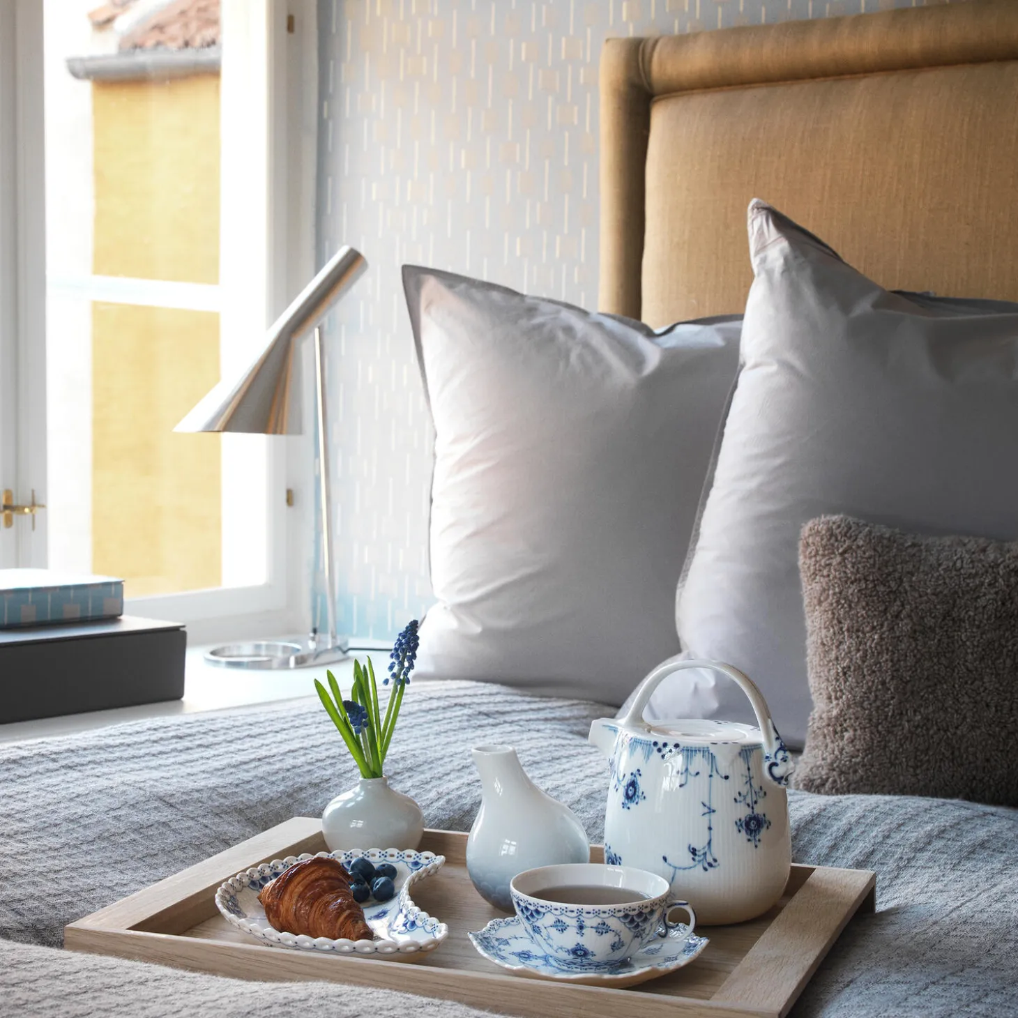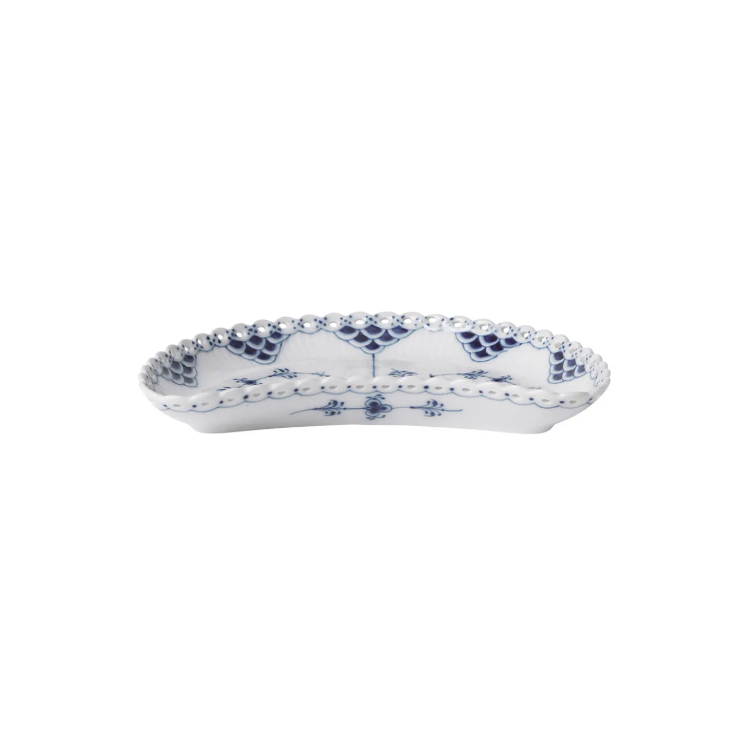 Musselmalet Helblonde halvmåneformet asiet i porcelæn fra Royal Copenhagen. Den halvmåneformede asiet på 22 cm fra Musselmalet Helblonde imponerer med det samme med sit særlige formsprog, som understreges af fadets håndmalede dekorationer og fine blondekant. Det alsidige fad er perfekt som en lille sidetallerken eller som et serveringsfad til tilbehør og søde sager.