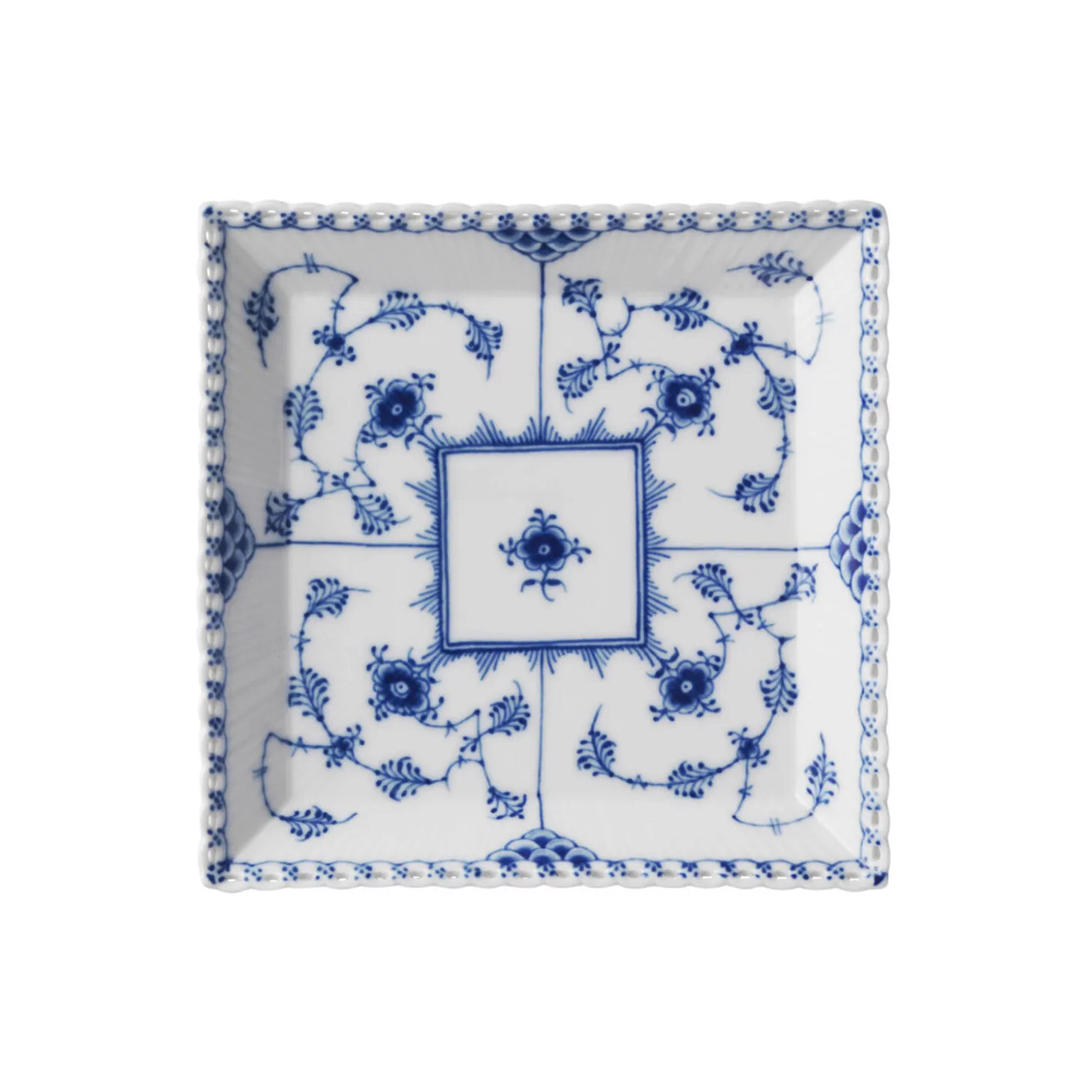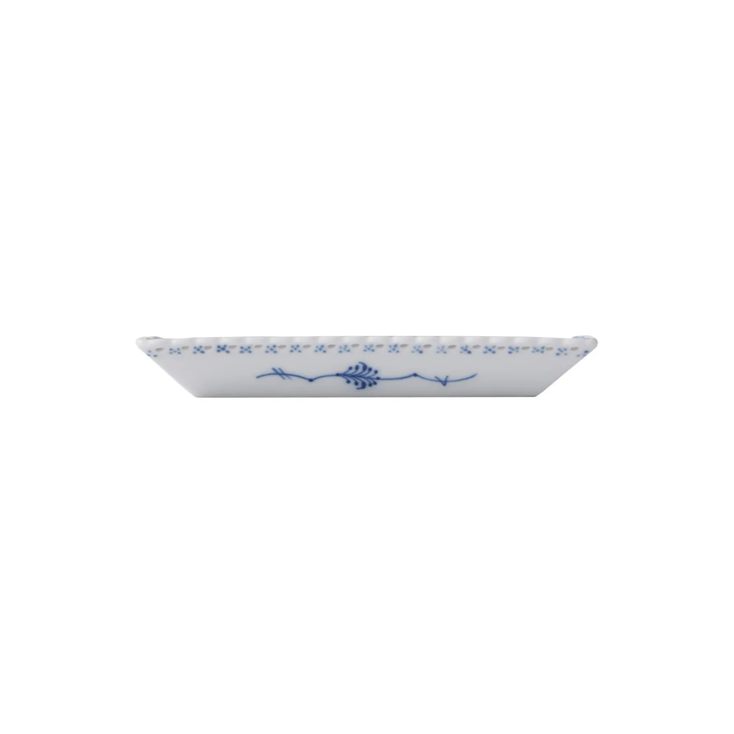 Musselmalet Helblonde lille firkantet tallerken i porcelæn fra Royal Copenhagen. Det iøjnefaldende, nutidige formsprog på den lille Musselmalet Helblonde tallerken på 14 cm komplimenteres smukt af en håndlavet blonde og stellets klassiske, håndmalede blomstermønster. Tallerkenen er perfekt som en lille sidetallerken til brød og andet tilbehør eller som desserttallerken.