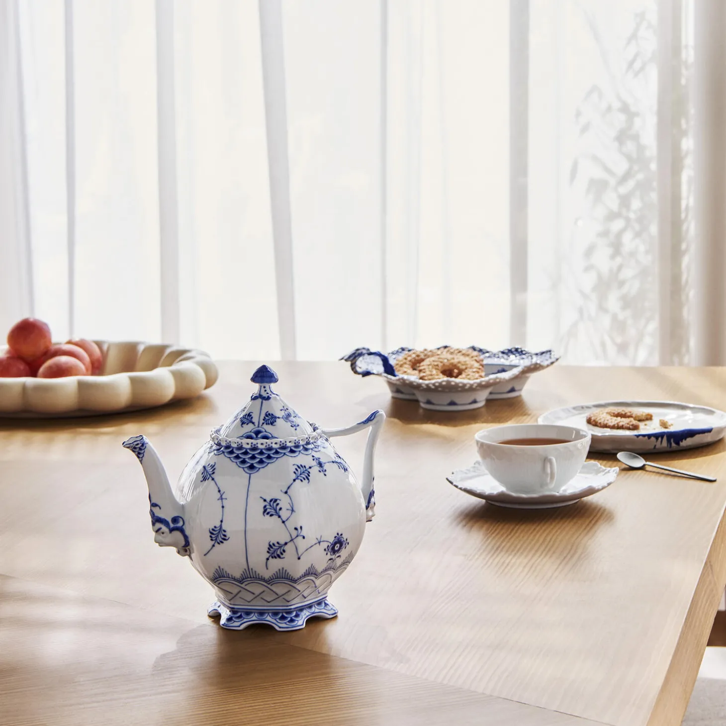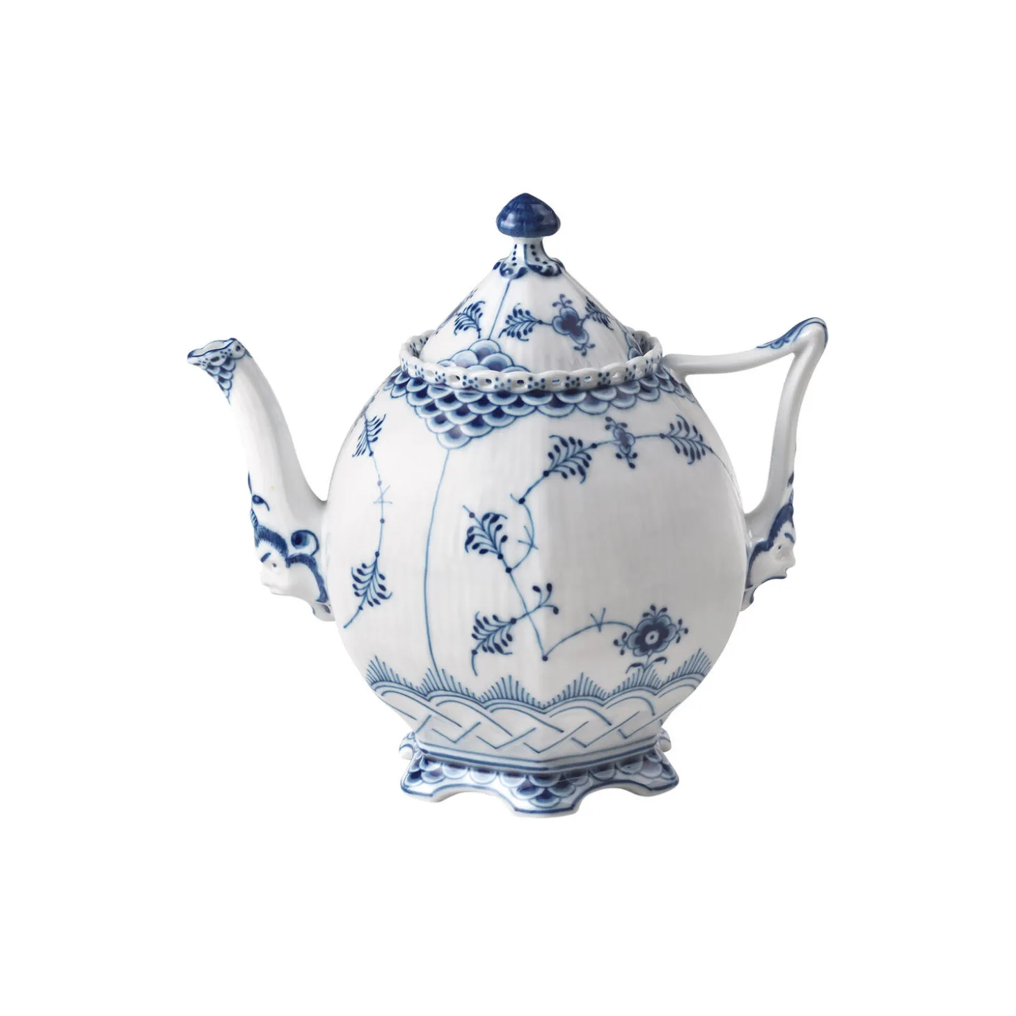 Musselmalet helblonde kollektion, der oprindeligt blev skabt i 1885, er et fremragende eksempel på Royal Copenhagens fine håndværk. Denne tekande er smukt udsmykket med blondedetaljer, et sneglehus på låget og barokmasker i bunden af tuden og håndtaget. Perfekt til både teelskere og porcelænssamlere.