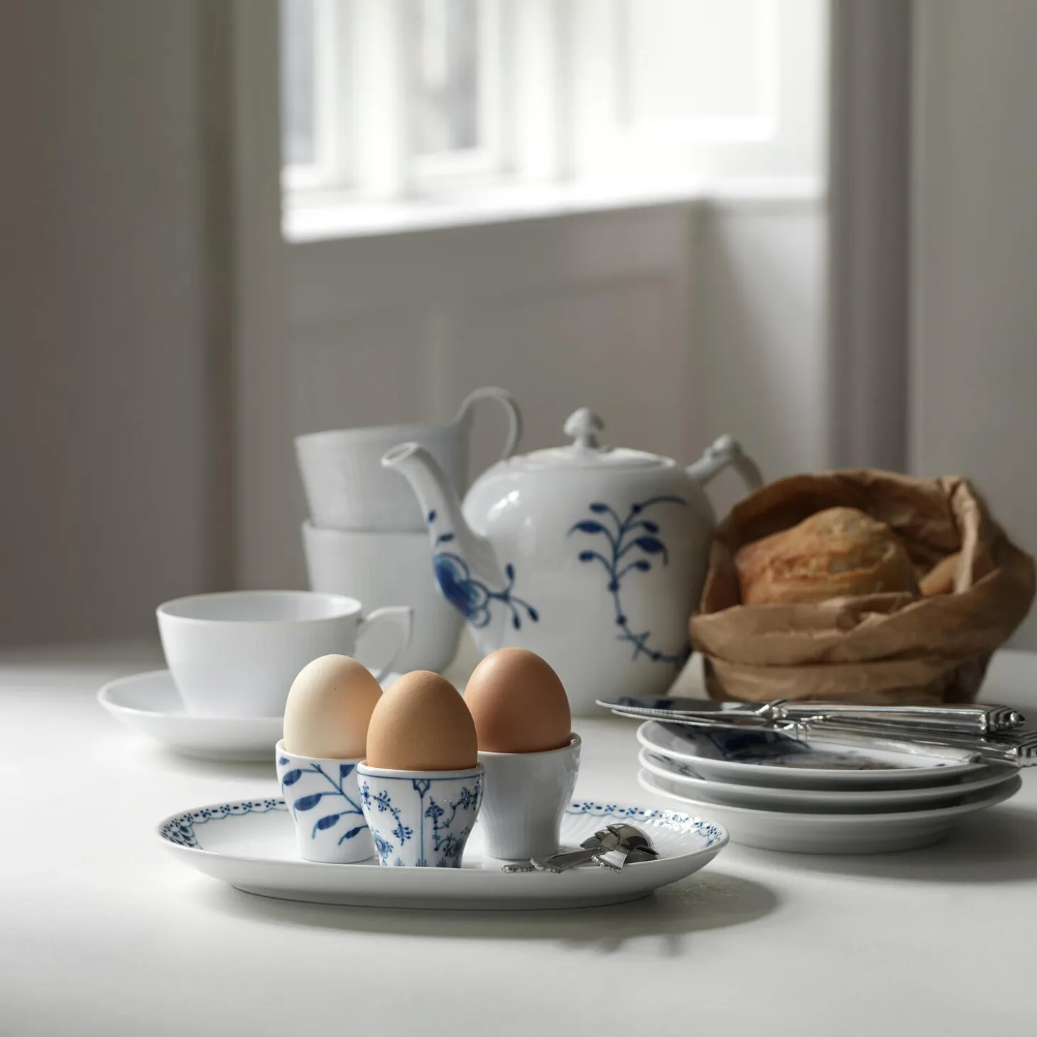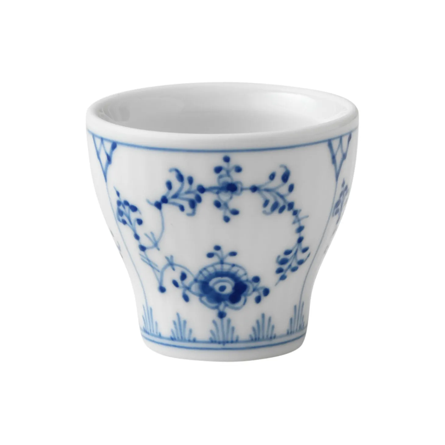 Musselmalet Riflet æggebæger i porcelæn fra Royal Copenhagen. Dette smukke lille æggebæger er håndmalet med det musselmalede mønster og har et udtryk, der på én og samme tid er nostalgisk og nutidigt. Æggebægeret passer til både små og store æg og fungerer også som et lille saltkar eller til opbevaring af de småting, der altid bliver væk.