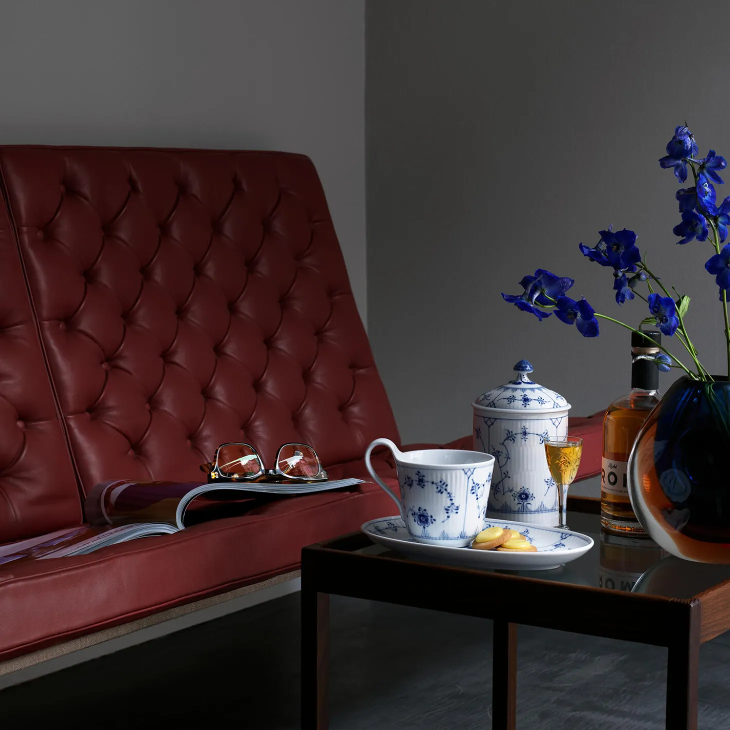 Musselmalet Riflet asiet i porcelæn fra Royal Copenhagen. Et smukt, ovalt fad som kan bruges til mindre serveringer eller som asiet til gæsternes brød eller andet på middagsbordet. Det elegante Musselmalet Riflet er håndmalet i et mønster, som sammen med fadets let buede kanter giver tallerkenen et tredimensionelt udtryk.