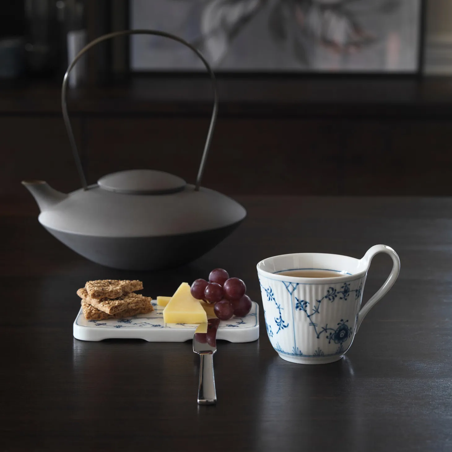 Musselmalet Riflet højhankskop i porcelæn fra Royal Copenhagen. En ny version af et elsket formsprog. Den nye, mindre Musselmalet Riflet højhankskop er den perfekte hverdagsfavorit med det samme, genkendelige mønster som den større højhankskop.