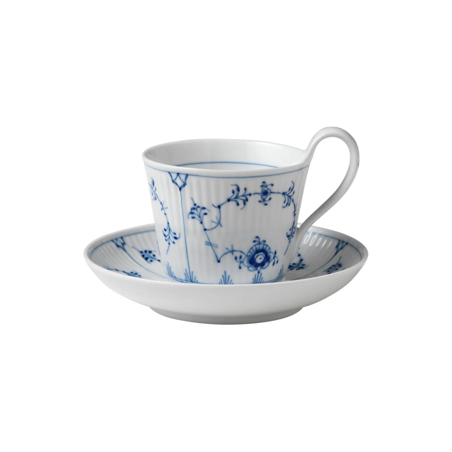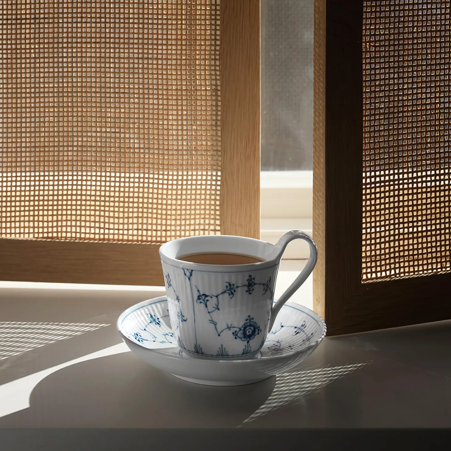 Musselmalet Riflet højhankskop med underkop i porcelæn fra Royal Copenhagen. Højhankskoppen med underkop i Musselmalet Riflet vil være en elegant tilføjelse til tetid og kaffetid. Den karakteristiske, høje hank er holdt i hvid som en smuk kontrast til det Musselmalede Riflede mønster på koppen og underkoppen. Underkoppen har en høj kant, og fungerer ligeledes som et lille serveringsfad til småkager eller andet.