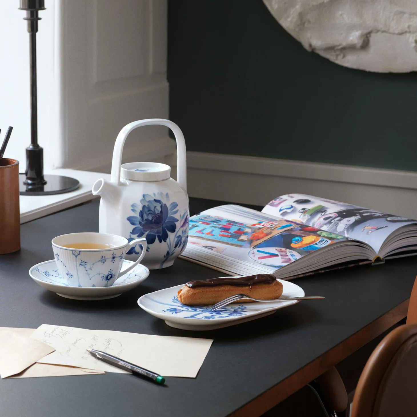 Musselmalet Riflet kop med underkop i porcelæn fra Royal Copenhagen. Den smukke tekop har en vid åbning, der lader teen køle hurtigt ned. Lad det smukke musselmalede mønster sætte scenen for et klassiske kaffebord eller skab et nyt og personligt udtryk ved at sætte tekoppen sammen med kopper og krus fra andre stel.