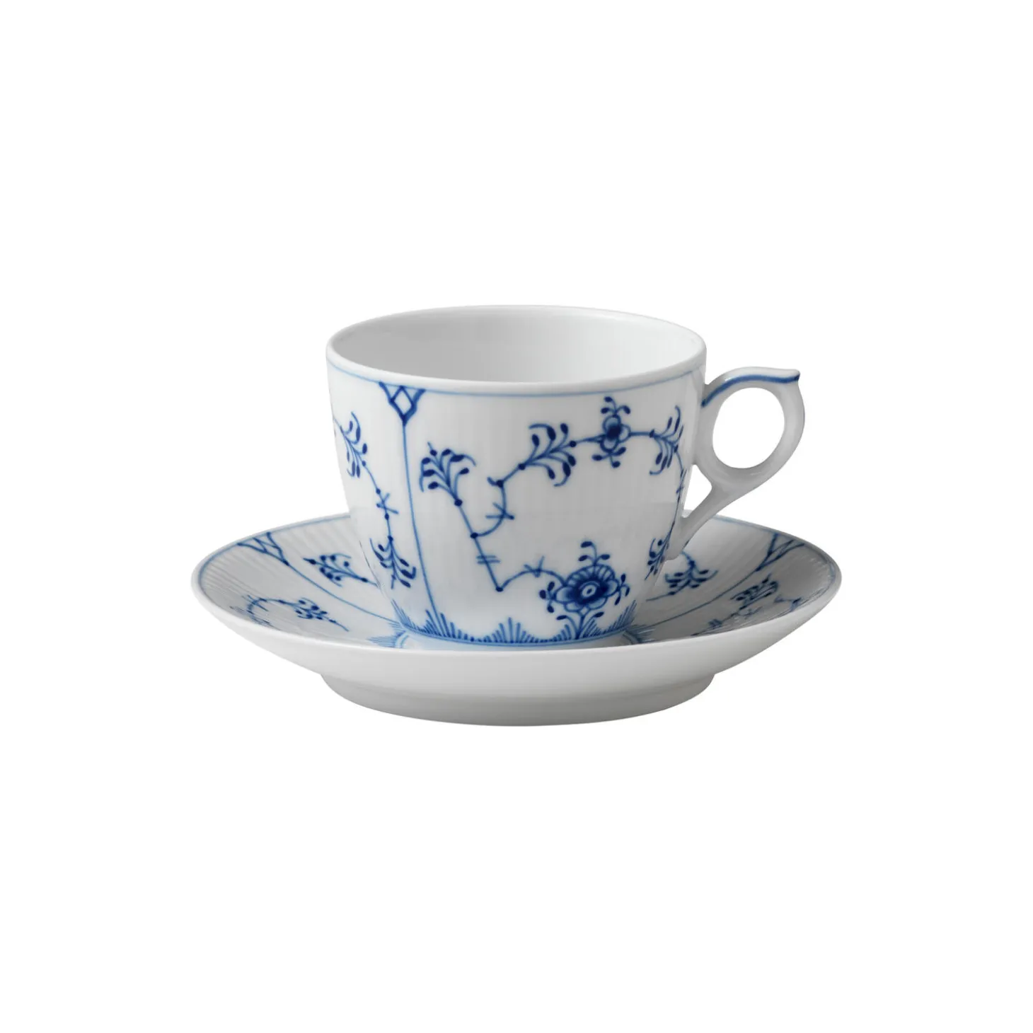 Musselmalet Riflet kop med underkop i porcelæn fra Royal Copenhagen. Den lille kop rummer dine varme favoritdrikke. Det historiske musselmalede mønsterfår et levende udtryk på den lille kop, og den elegante hank er en smuk og simpel detalje.