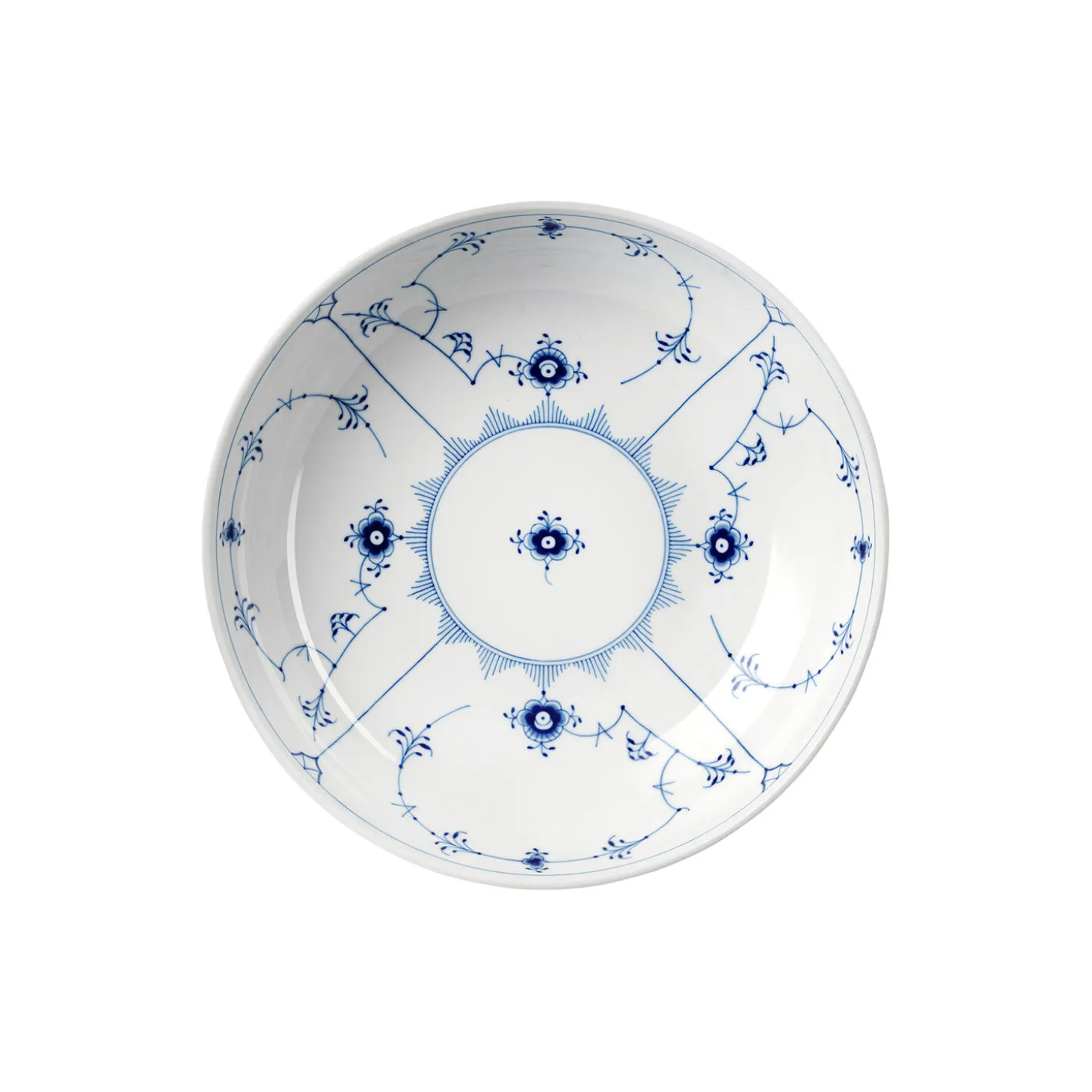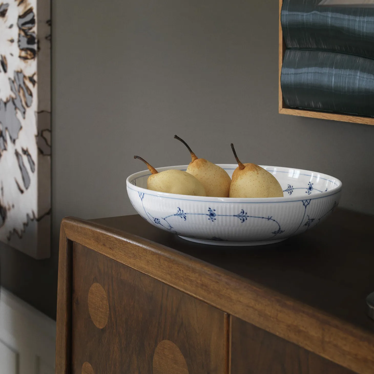 Musselmalet Riflet skål i porcelæn fra Royal Copenhagen. Denne 240 cl skål er håndmalet med det historiske mønster fra Musselmalet Riflet og fungerer perfekt til mange slags serveringer eller som et enestående designobjekt i hjemmet. Den 240 cl Musselmalet Riflet skål er en del af et smukt udvalg af Royal Copenhagens serveringsskåle. Den egner sig både til større servering og gør sig også som et elegant designobjekt i hjemmet.