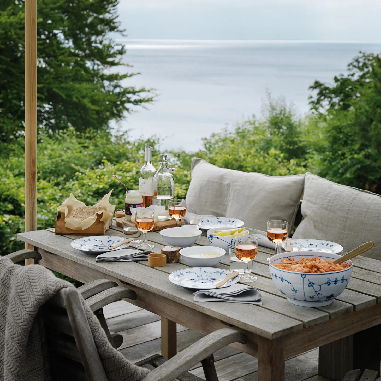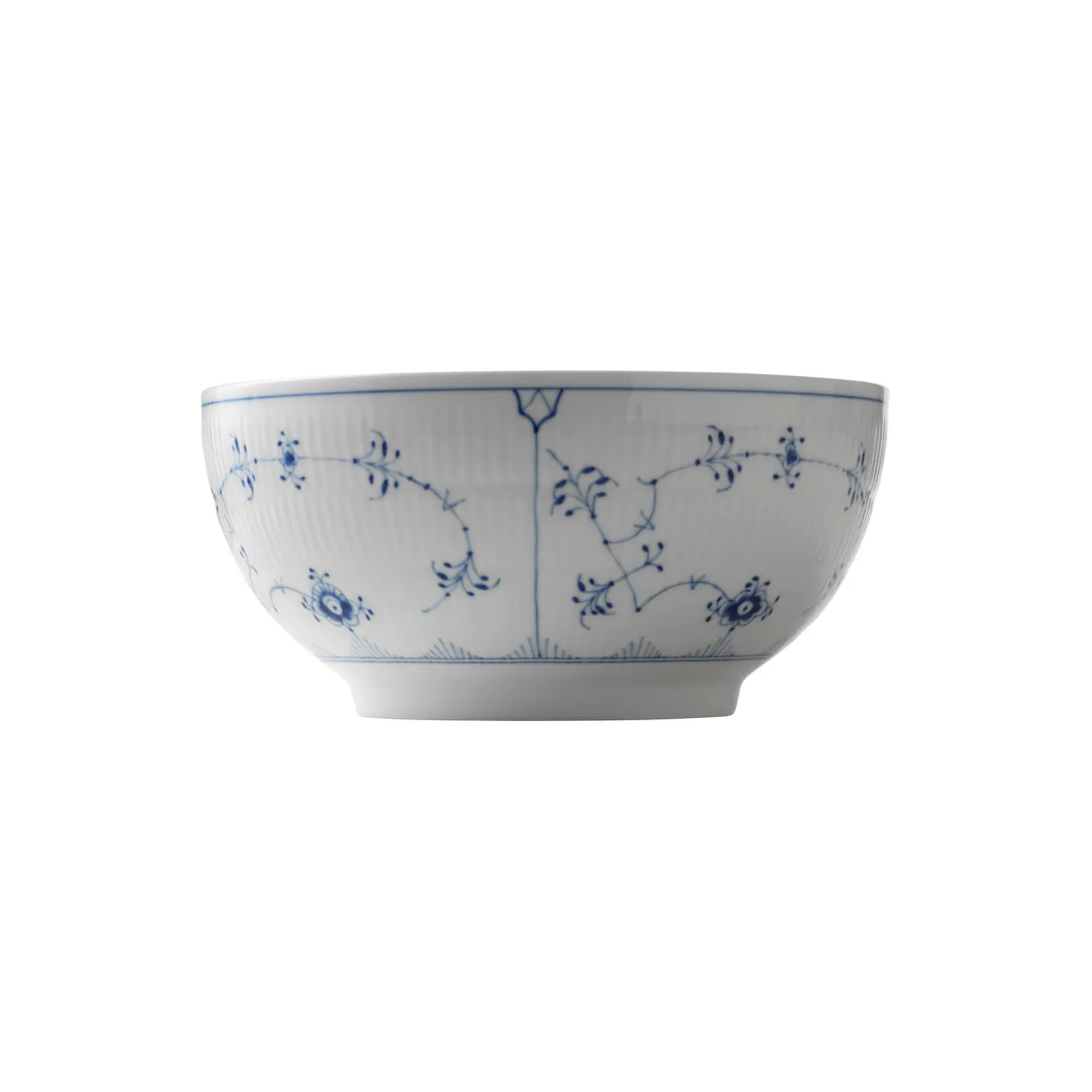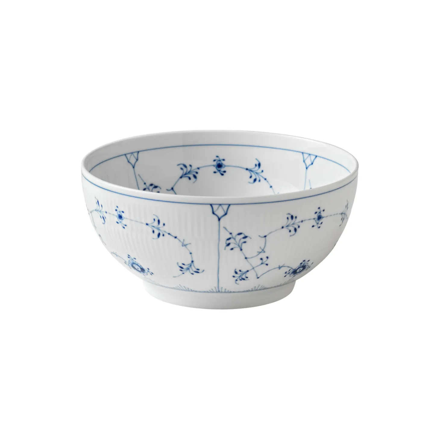 Musselmalet Riflet skål i porcelæn fra Royal Copenhagen. Trods alle skålene i Musselmalet Riflet bærer samme håndmalede mønster, får denne skål sit helt eget særpræg i kraft af sin størrelse. Skålen er blandt andet ideel til årstidens lækre salater. Royal Copenhagens første stel fra 1775, Musselmalet Riflet, fortryller med sin klassiske alsidighed og er stadig i dag evigt tidløst. Stellets elegante mønster understreger porcelænets fine formsprog og håndværket bag hver enkelt stykke porcelæn. Musselmalet Riflet er det perfekte udgangspunkt for en personlig samling af Royal Copenhagen.