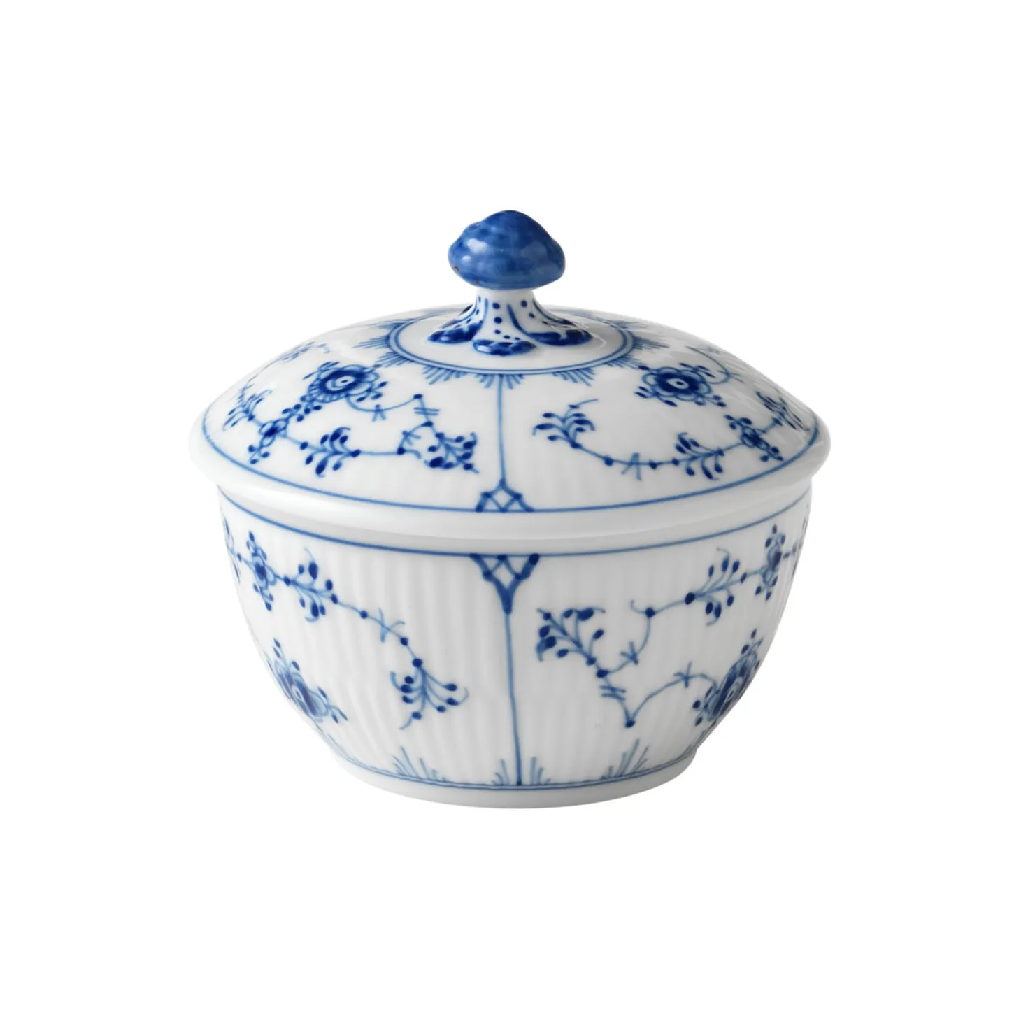 Musselmalet Riflet sukkerskål i porcelæn fra Royal Copenhagen. Denne charmerende, lille sukkerskål med låg er en klassisk steldel i Musselmalet Riflet. Det smukke mønster har fået selskab af en fin lille svamp på låget. Brug også skålen som en lille serveringsskål til snacks.