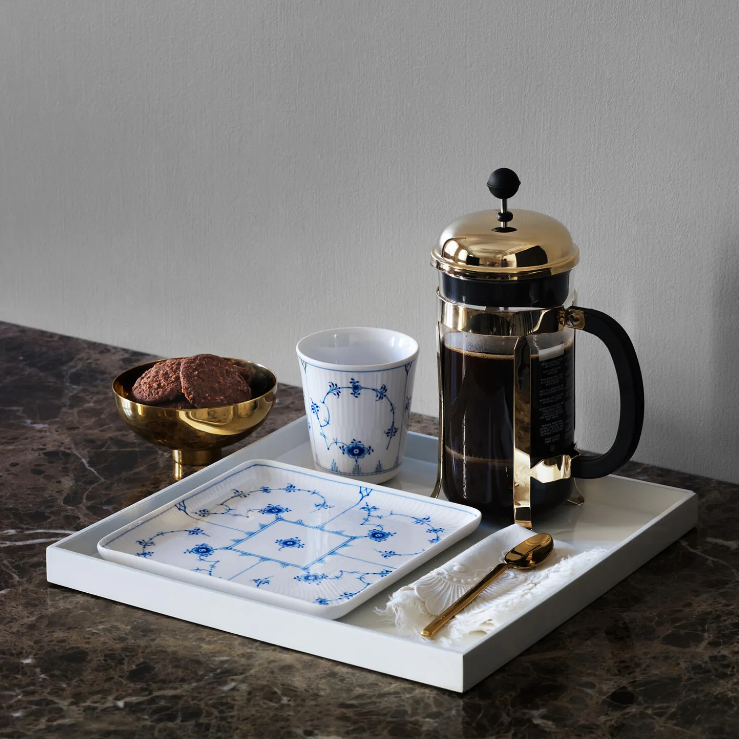 Musselmalet Riflet frokosttallerken i porcelæn fra Royal Copenhagen. Den smukke, kvadratiske tallerken er elegant hvad enten den benyttes til servering eller som spisetallerken. Det klassiske, musselmalede mønster er tilpasset tallerkenens form, hvilket skaber et skarpt og harmonisk udtryk.