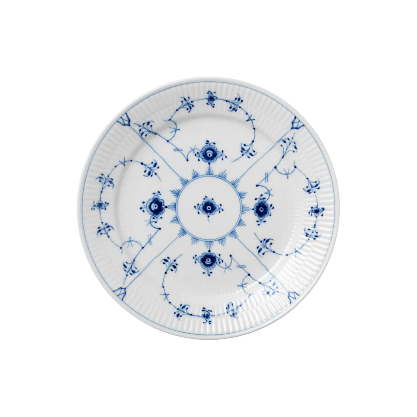 Musselmalet Riflet middagstallerken i porcelæn fra Royal Copenhagen. Tallerkenen på 25 cm i Musselmalet Riflet er ideel som middagstallerken eller til den store frokostplatte. Det tidløse mønster er på én gang stringent og organisk med sine lige linjer og svungne ranker med palmetter.
